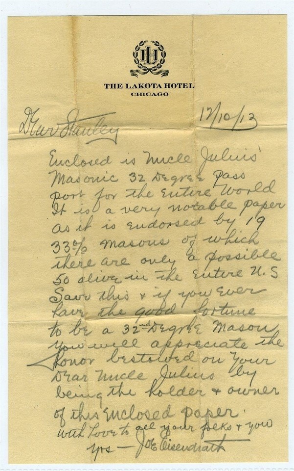There are 2 items in this lot. A 14" x 8 1/8 " Ordo ab Chao , Supreme Council, making Julius C Calisch a Sublime Prince of the Royal Secret 32 of the Buffalo Consistory on March 27, 1903. the certificate is signed on the back by 19 different 33rd Degree members and Signed by the Commander in Chief . There is also a letter sent along with the certificate explaining the significance of the Certificate.