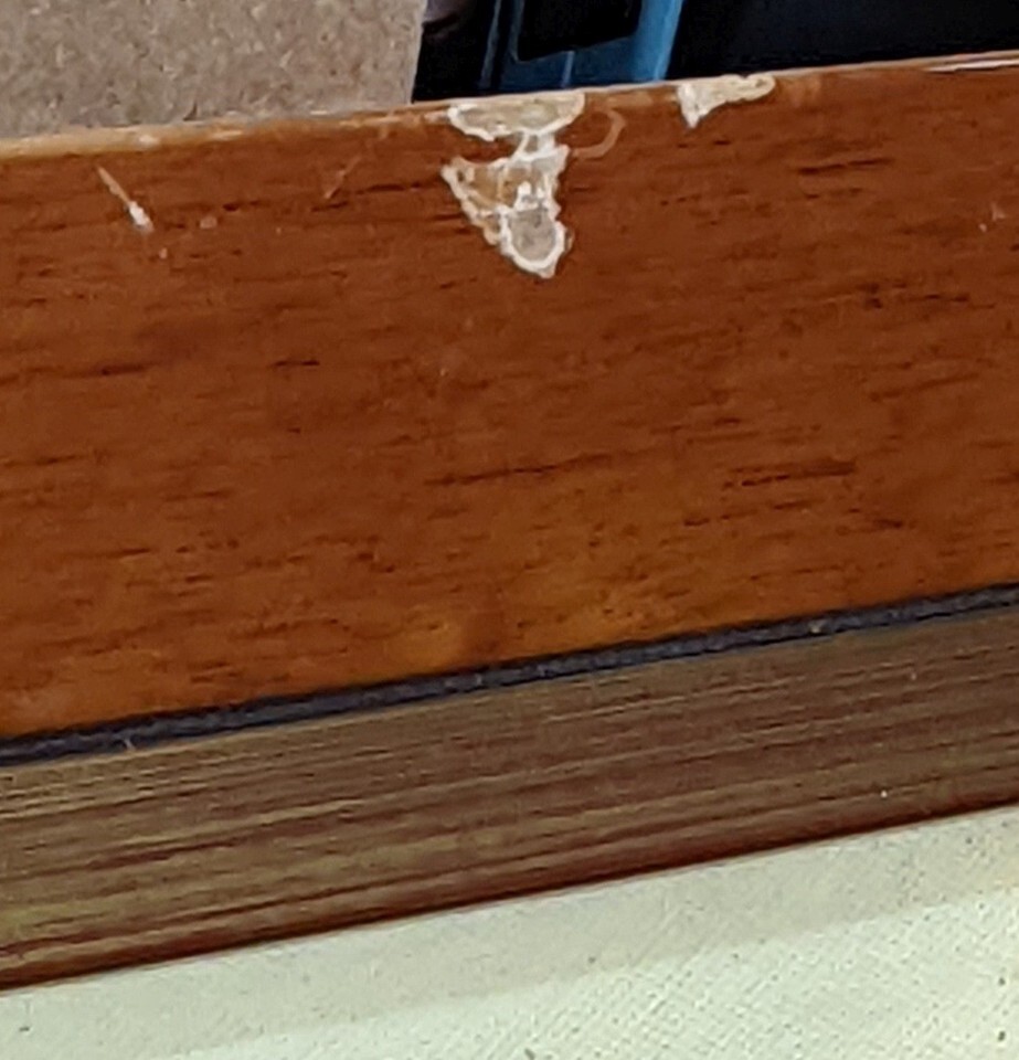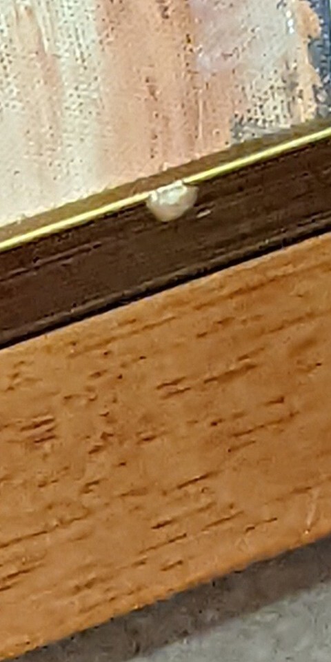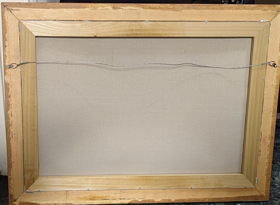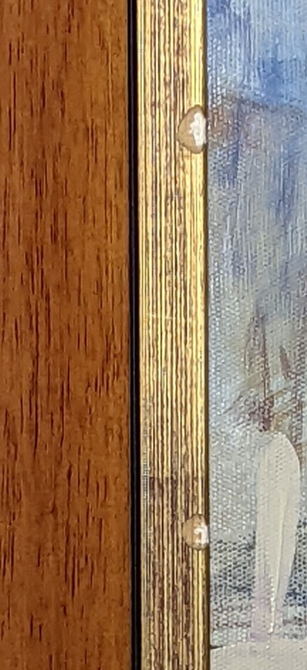 The frame has bumps and scrapes. Reframe it or just hang the stretched canvas. This piece would actually show great without a frame.