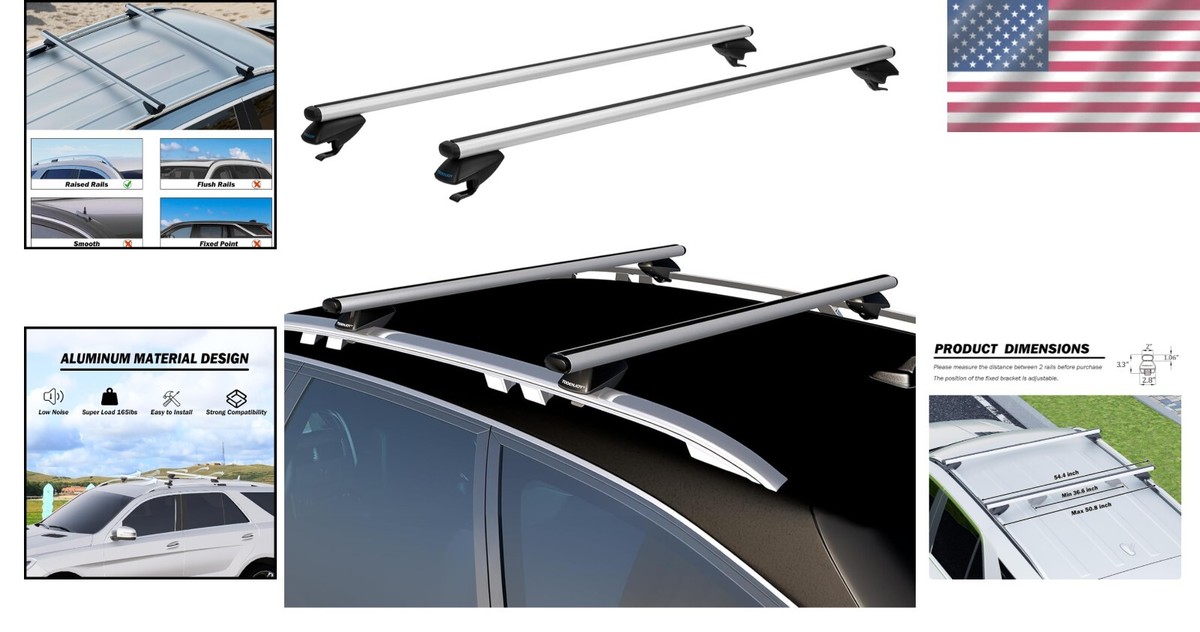 Raised Rail Fit: Adjustable from 36.6 inches to 50.8 inches, compatible with Cars, Vehicles, and SUVs with raised side rails with a gap between 36.6 and 50.8 inches.