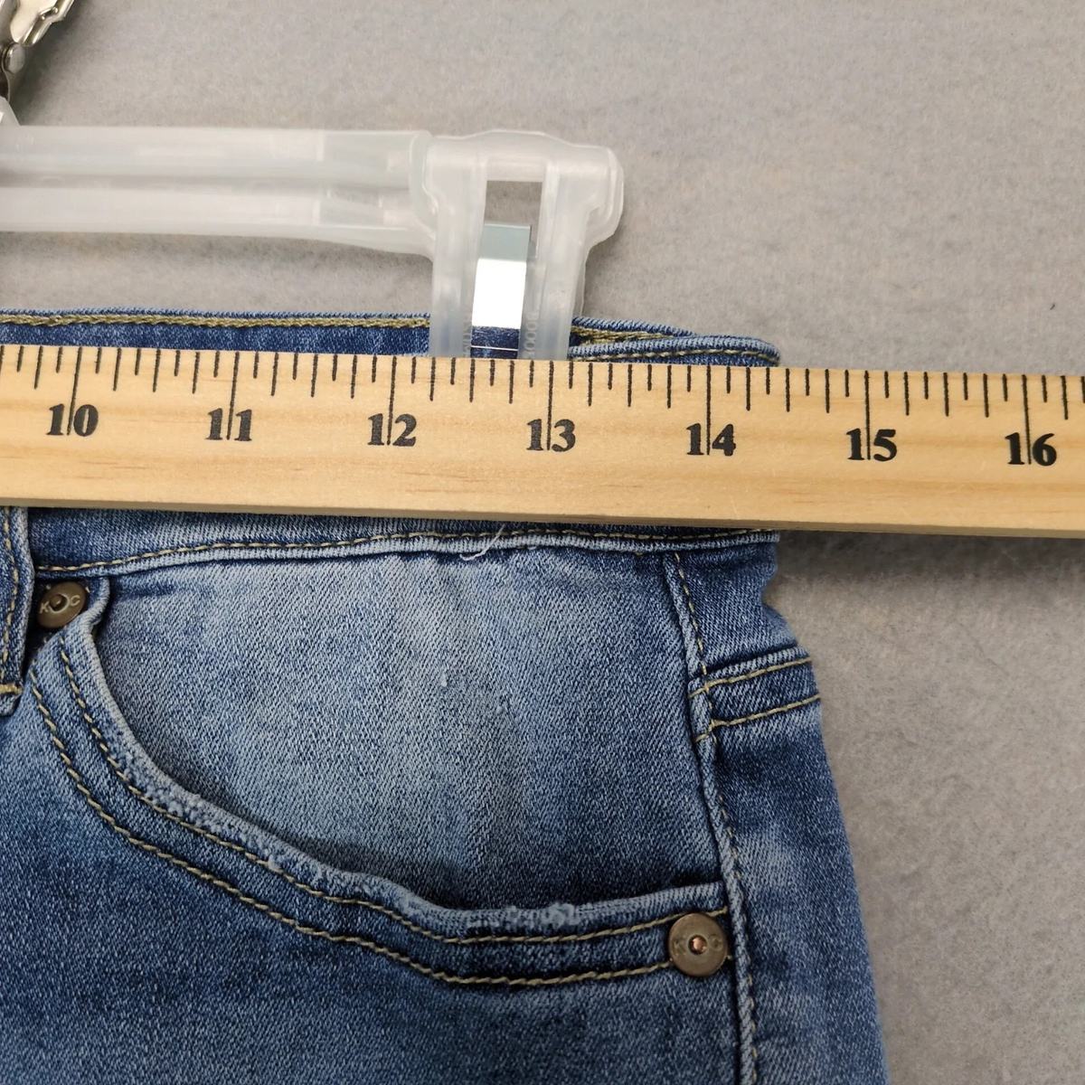 Features: Cut-Off Style, Slim Fit, Mid Rise, Cuffed, Easy Care, Pockets, Stretch, 29 in Measured Waist, 4.5 in Inseam, Zip Closure, 5-Pocket Design, Solid Pattern, Distressed, Logo, Machine Washable