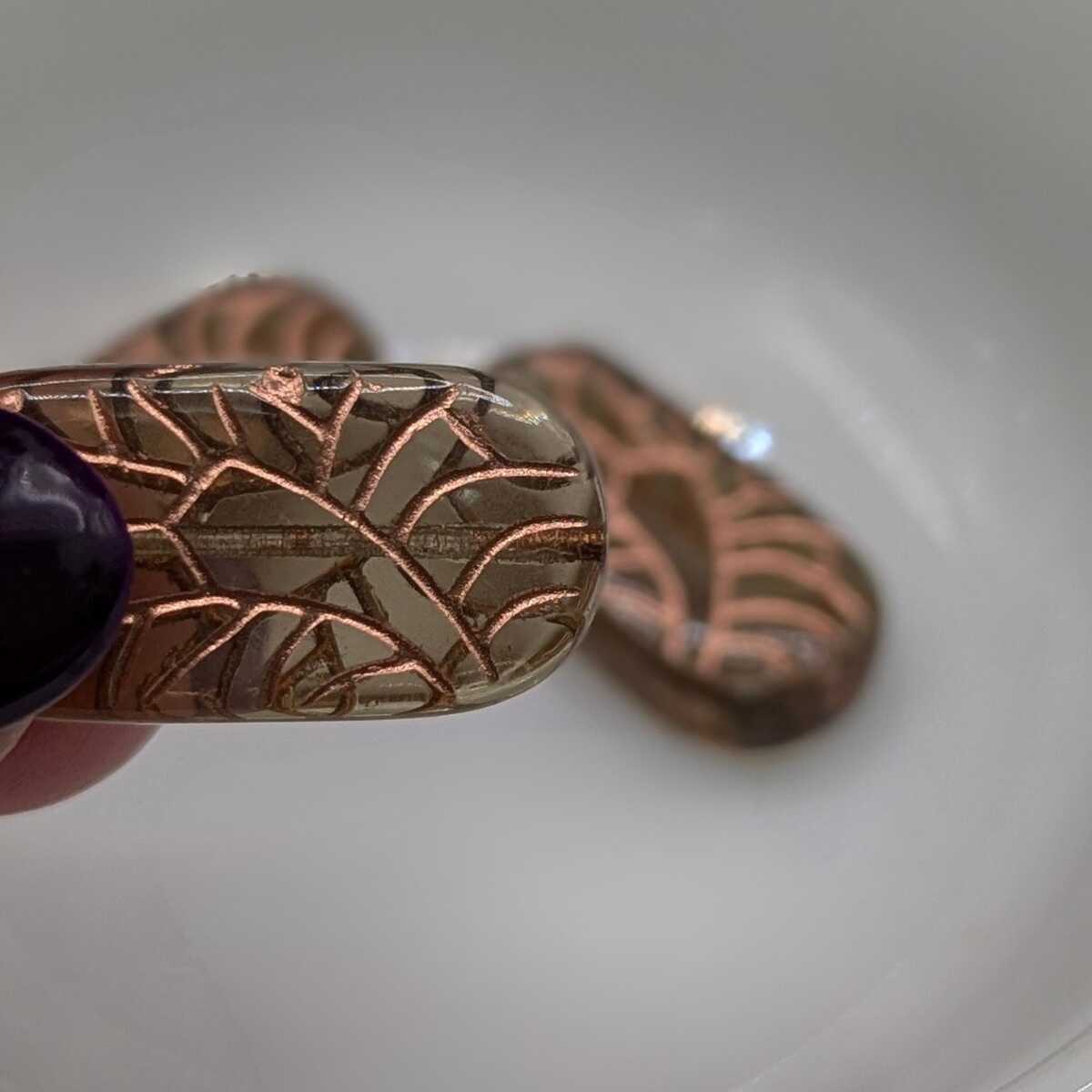 These beautiful Czech glass beads feature a clear smoky base with an intricate copper-lined etched leaf design that catches the light beautifully. Each bead is artisan-pressed in the Czech Republic and finished with a rich metallic wash that highlights every detail.