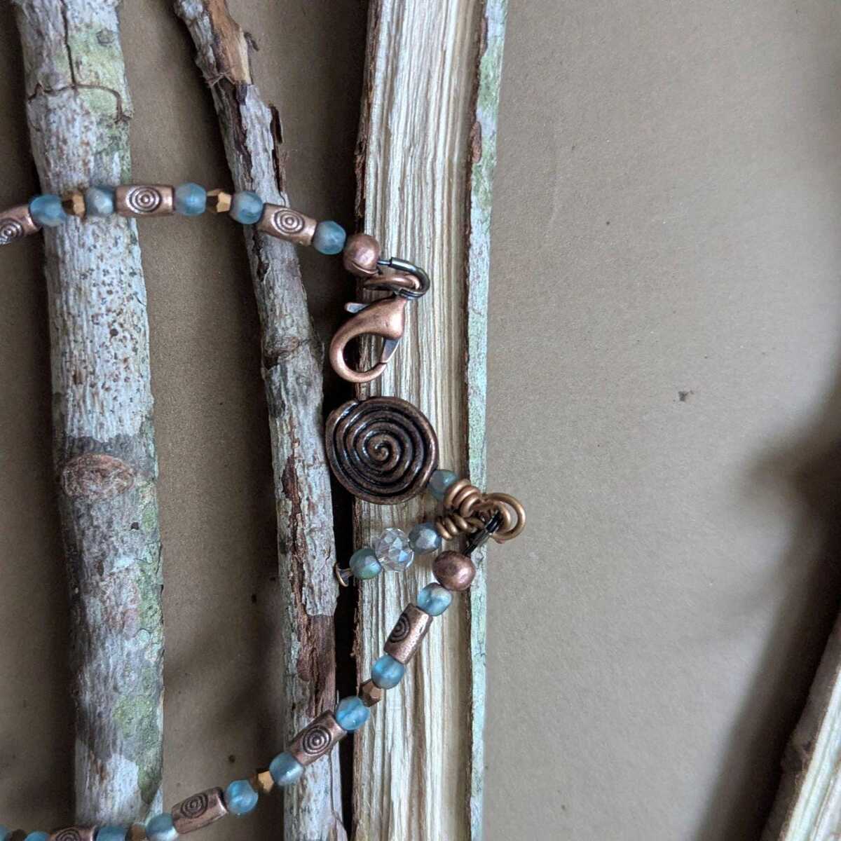Embrace earthy elegance with this handcrafted bracelet featuring a harmonious blend of oceanic blues and warm copper tones. Small round beads in varying shades of blue and green are beautifully interspersed with copper-colored spiral-patterned cylinders, creating a rhythmic and balanced design. Three larger translucent blue stones add a bold touch, while the repeating spiral motif evokes a sense of movement and unity.