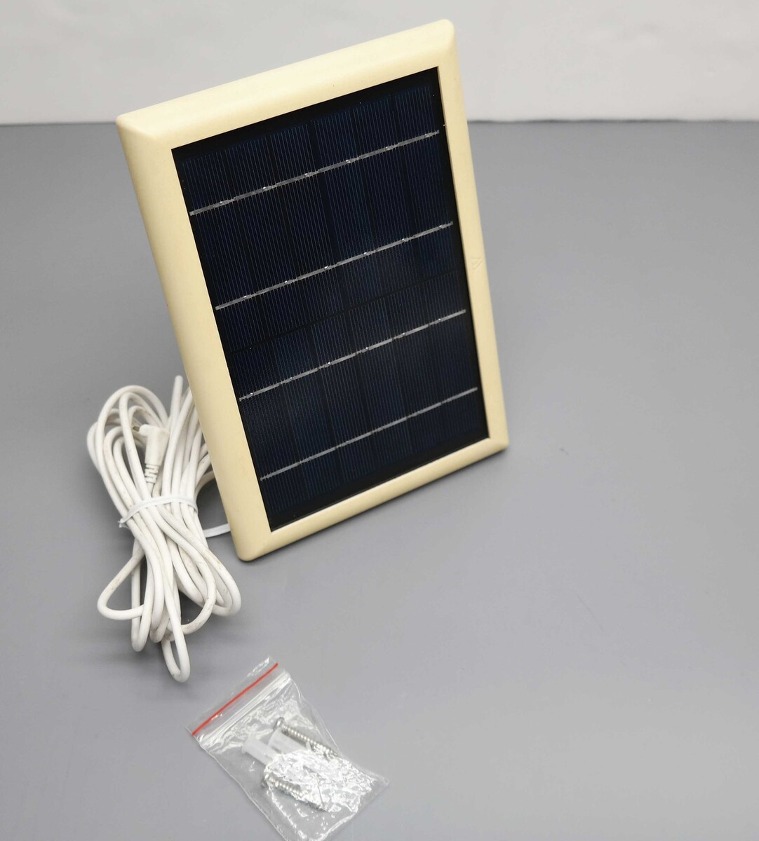 Description: Includes Solar Panel, Mounting Bracket, Charging Cable, Screws and Wall Anchors. Scratched and yellowed body.