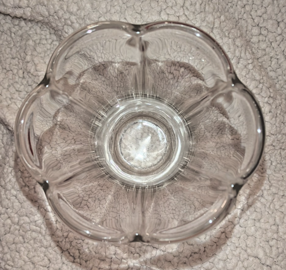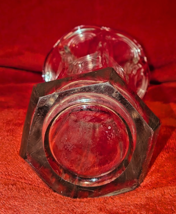 This is a vintage mid-century clear glass Swung style vase, 7 1/2" tall, approx. 4 1/4" wide at the top, approx. 3 1/4" wide at the base. The base is hexagonal extending up to a lovely scalloped edge at the top, and is unsigned. The vase is in good vintage condition with expected air bubbles throughout, but no chips or cracks.