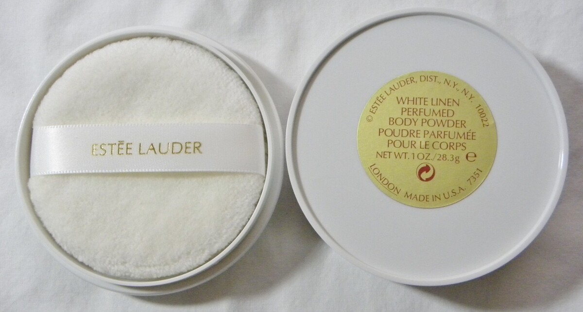 For Sale...Small 1oz Estee Lauder WHITE LINEN perfumed Body Powder with soft velour dusting pad in a white plastic "White Linen" logo jar.. There is NO outer BOX, but it's SEALED;unopened. Thanks for looking!