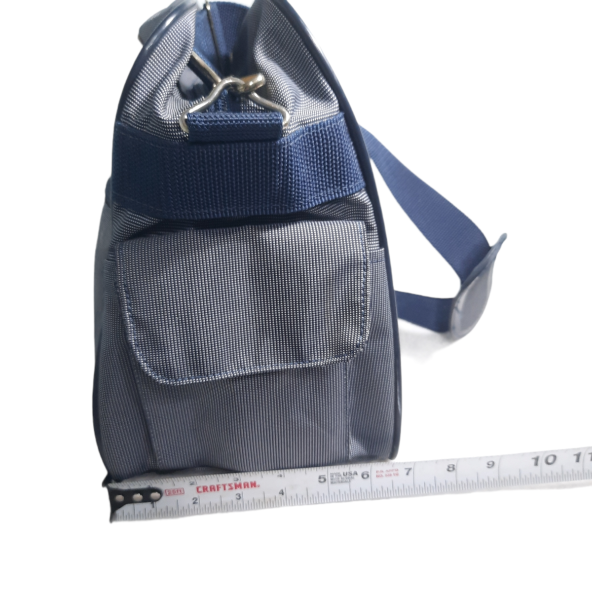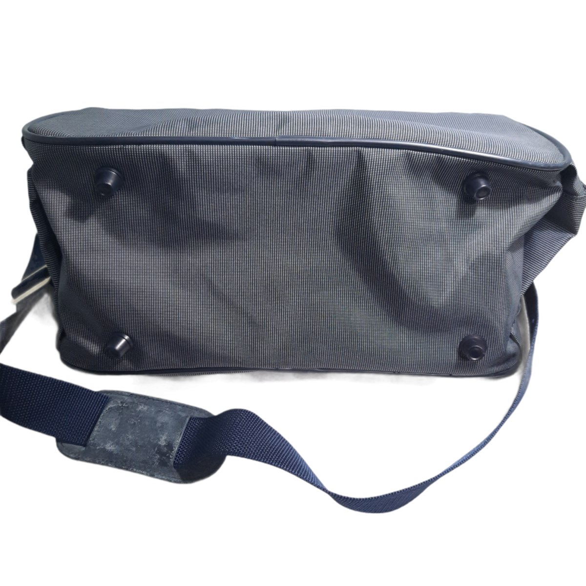 Navy blue dot carry on bag with plenty of pockets on the outside. Some wear to the underside of the strap pad as shown. See pics for measurements. In very good condition.