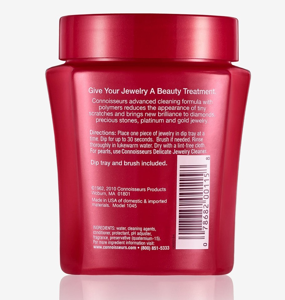 FOR SALE IS ONE (1) NEW 8 fluid ounce PLASTIC JAR OF FINE JEWELRY LIQUID CLEANER FOR GOLD, PLATINUM, DIAMONDS AND PRECIOUS STONES WITH CONVENIENT DIP TRAY (basket) 8 fluid ounce JAR MANUFACTURED BY CONNOISSEURS PRODUCTS CORPORATION MPN 1045 UPC# 078682001158. THIS ITEM WAS FORMERLY KNOWN AS PRECIOUS JEWELRY CLEANER, NOW KNOWN AS FINE JEWELRY CLEANER WITH THE SAME FORMULATION, SAME JAR, SAME UPC# ONLY A DIFFERENT PRODUCT NAME. MADE IN THE USA, REGULAR CLEANING WITH CONNOISSEURS PRECIOUS JEWELRY CLEANER WILL BRING OUT THE BRILLIANCE IN YOUR GOLD, PLATINUM, DIAMONDS AND PRECIOUS STONE JEWELRY. SPECIAL POLYMERS IN THIS AMMONIA FREE FORMULA HELP REDUCE THE APPEARANCE OF TINY SCRATCHES IN JEWELRY SETTINGS WHERE DIRT AND GERMS ACCUMULATE. THIS ADVANCED POLYMER SYSTEM REPELS SOIL FOR LONGER LASTING SHINE AND ALSO HELPS REDUCE THE APPEARANCE OF FINE SCRATCHES. THIS ULTRA SAFE AND EFFECTIVE WAY TO CLEAN MOST METALS USED TODAY, FORMERLY KNOWN AS PRECIOUS JEWELRY CLEANER. THIS ITEM INCLUDES JEWELRY DIP TRAY (basket) AND JEWELRY BRUSH. YOU WILL RECEIVE ONE (1) 8 fluid ounce JAR OF CONNOISSEURS PRECIOUS JEWELRY CLEANER FOR GOLD, PLATINUM, DIAMONDS AND PRECIOUS STONES WITH DIP TRAY AND CLEANING BRUSH SHIPPED BY USPS FIRST CLASS MAIL.....