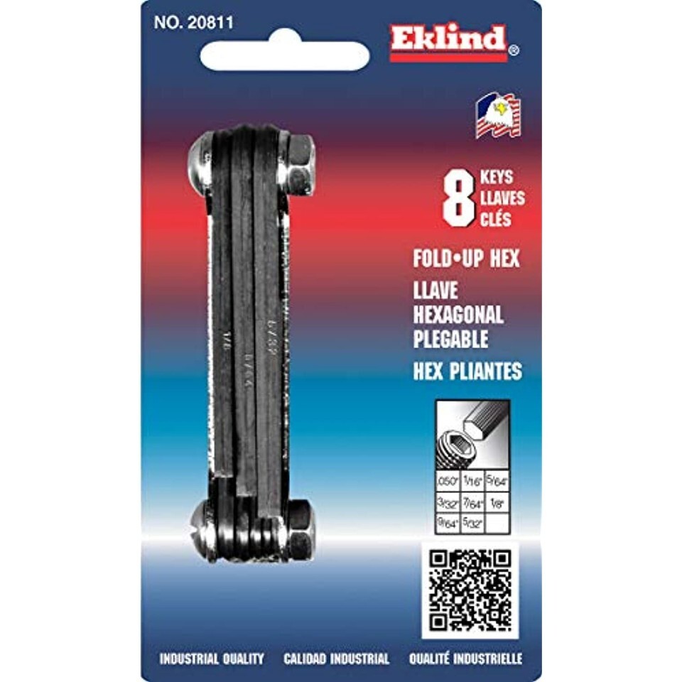 Product Description EKLIND TOOL COMPANY is America's leading manufacturer of high quality, industrial grade hex keys, made with pride in the U.S.A. since 1950. The EKLIND 20811 Steel Handle Fold-up Hex Key allen wrench - 8pc set SAE Inch Sizes .050-5/32 meets the most stringent requirements of professional mechanics, tradespeople, do-it-yourselfers and hobbyists. From the Manufacturer The Eklind 20811, Fold-Up Set #81 comes with 0.050-Inch, 1/16-Inch, 5/64-Inch, 3/32-Inch, 7/64-Inch, 1/8-Inch, 9/64-Inch, and 5/32-Inch Hex Keys. The set of keys is housed in a one-Piece comfort grip handle designed to operate smoothly as well as hold the keys firmly in any desired work position.