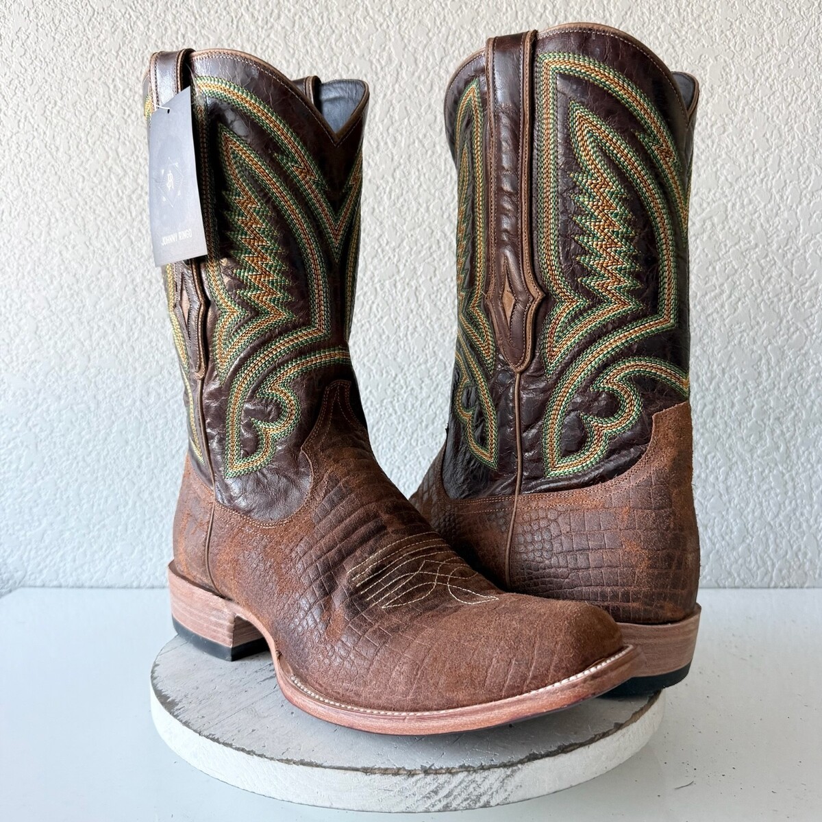 These Johnny Ringo men?s western cowboy boots feature a classic square toe with rich brown leather and detailed stitched shafts. Traditional pull-on styling with leather soles makes them suitable for everyday wear, riding, or western events. Quality craftsmanship throughout, consistent with Johnny Ringo?s reputation for bold western design.