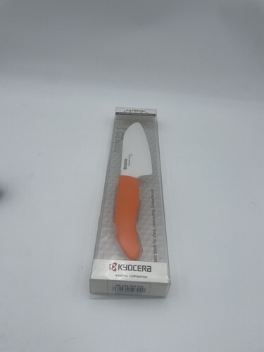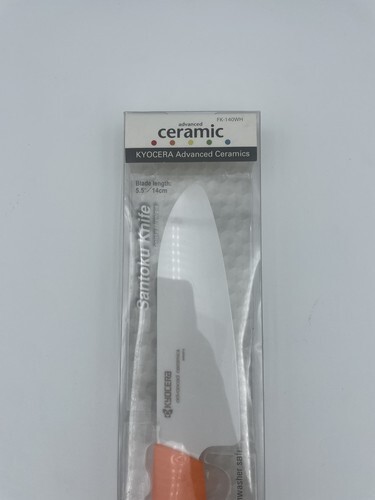 The Kyocera Advanced Ceramic Revolution 5.5" Santoku Knife FK-140 WH-OR is a high-quality kitchen knife perfect for slicing, dicing, and mincing various types of food including fruits, vegetables, and meats. This sleek white knife features a straight blade edge made of durable ceramic material, ensuring easy cutting and precision. The knife comes with a comfortable orange plastic handle and is designed by the reputable brand Kyocera in Japan, making it a reliable and versatile addition to any kitchen.