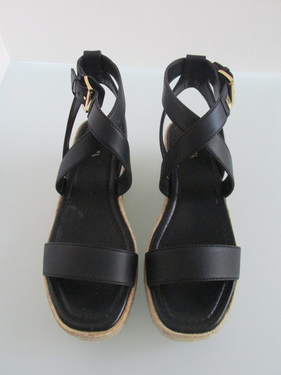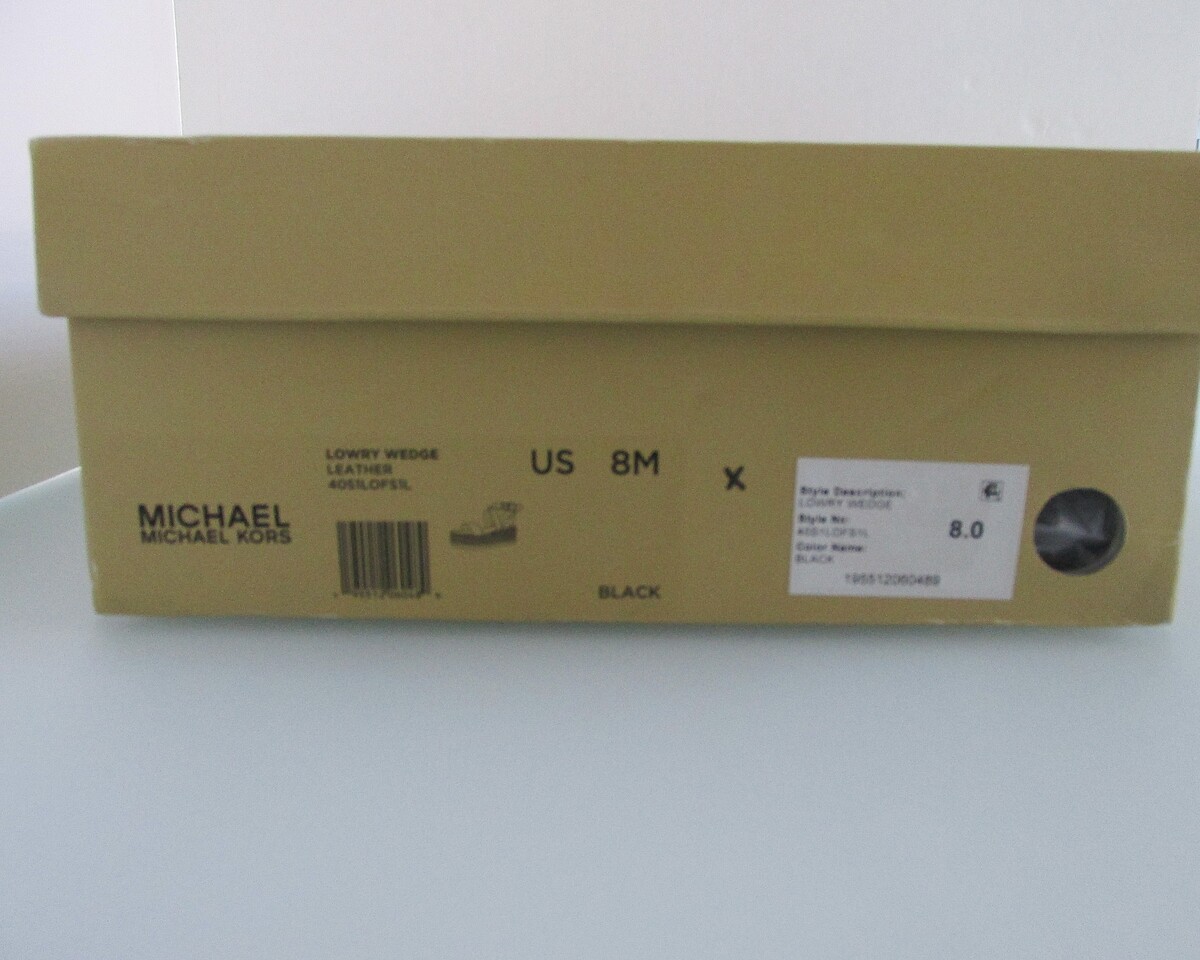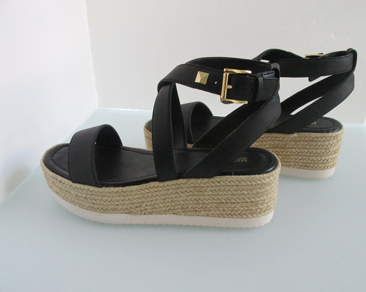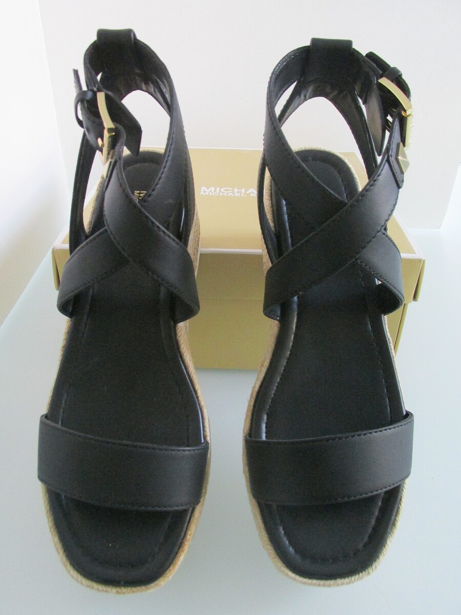 Description: Up for sale is a pair of Michael Kors "Lowry Wedge" new leather espadrille wedges. These black leather wedges are US size 8 M. They have leather uppers with a gold buckle on the ankle strap with a gold embellishment. They feature braided hemp sides on the 2.50" platform. These shoes come with the original box.