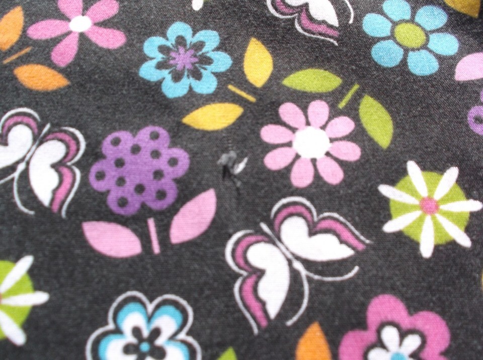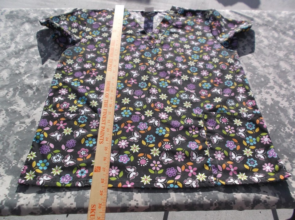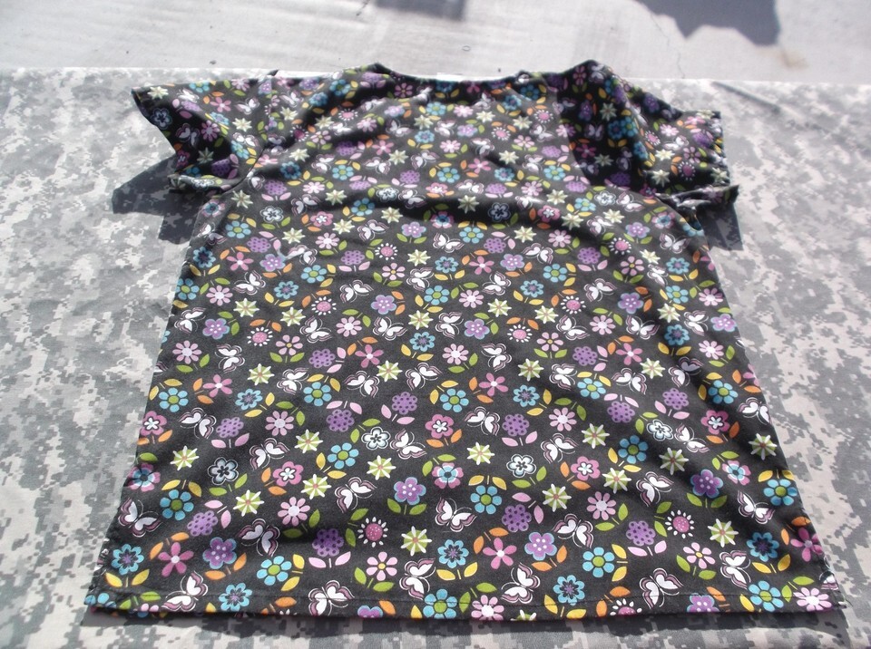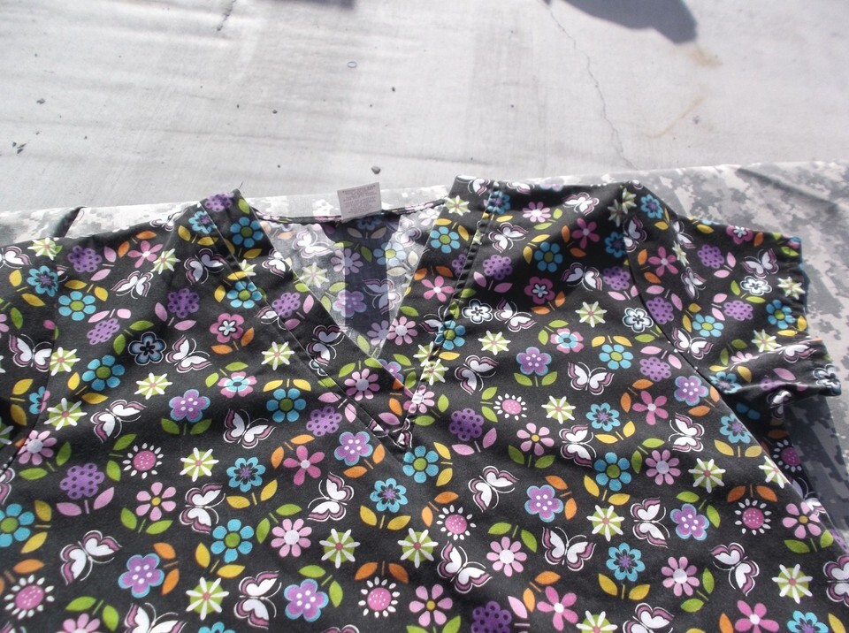 Cassandra O Black Multi Colored Flower & Butterfly Design Large Scrub Top 6779