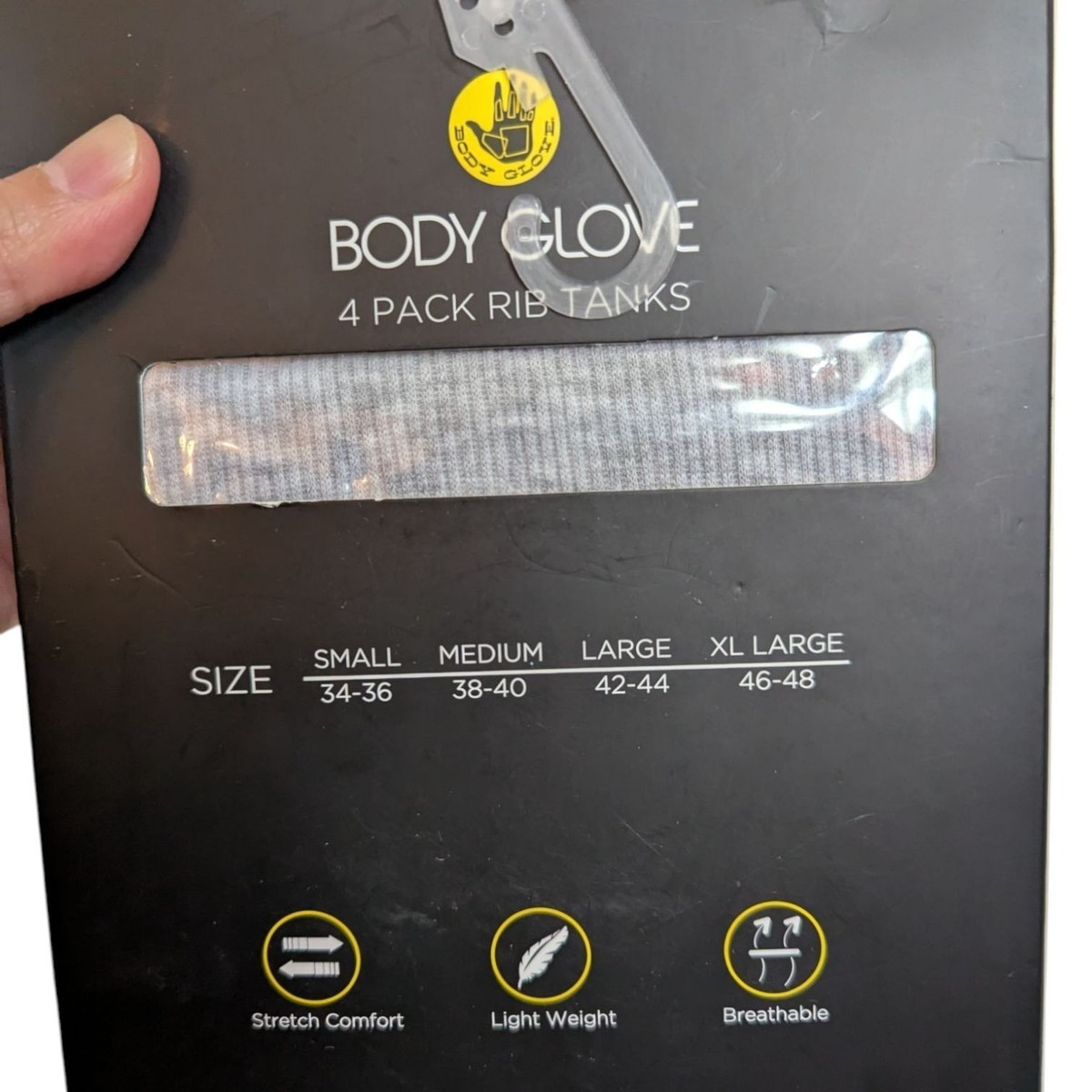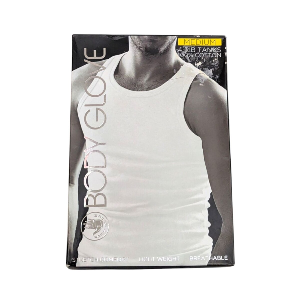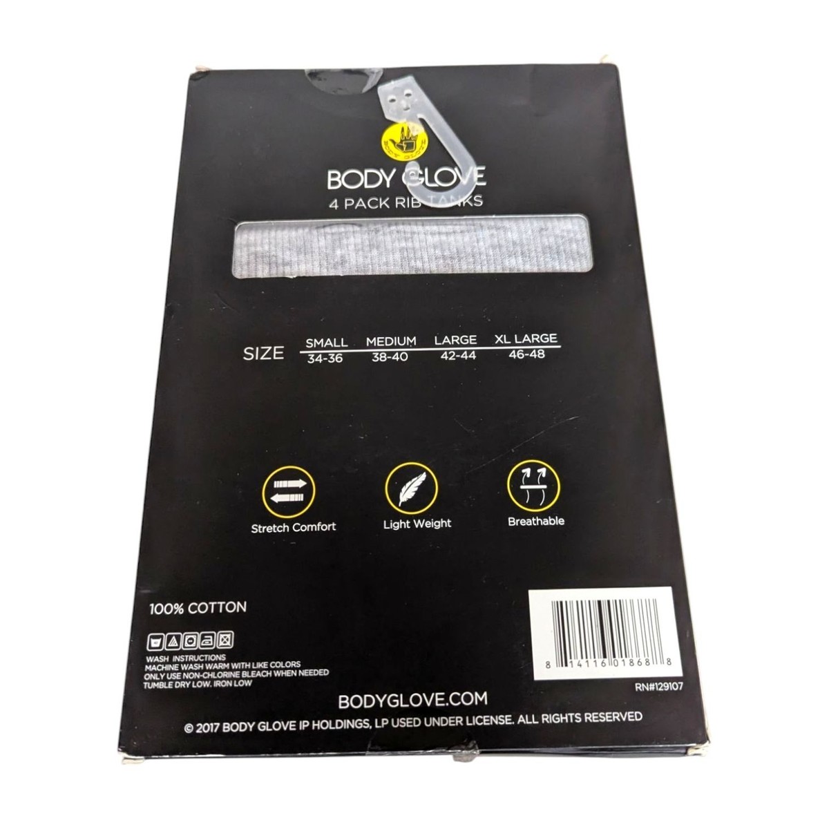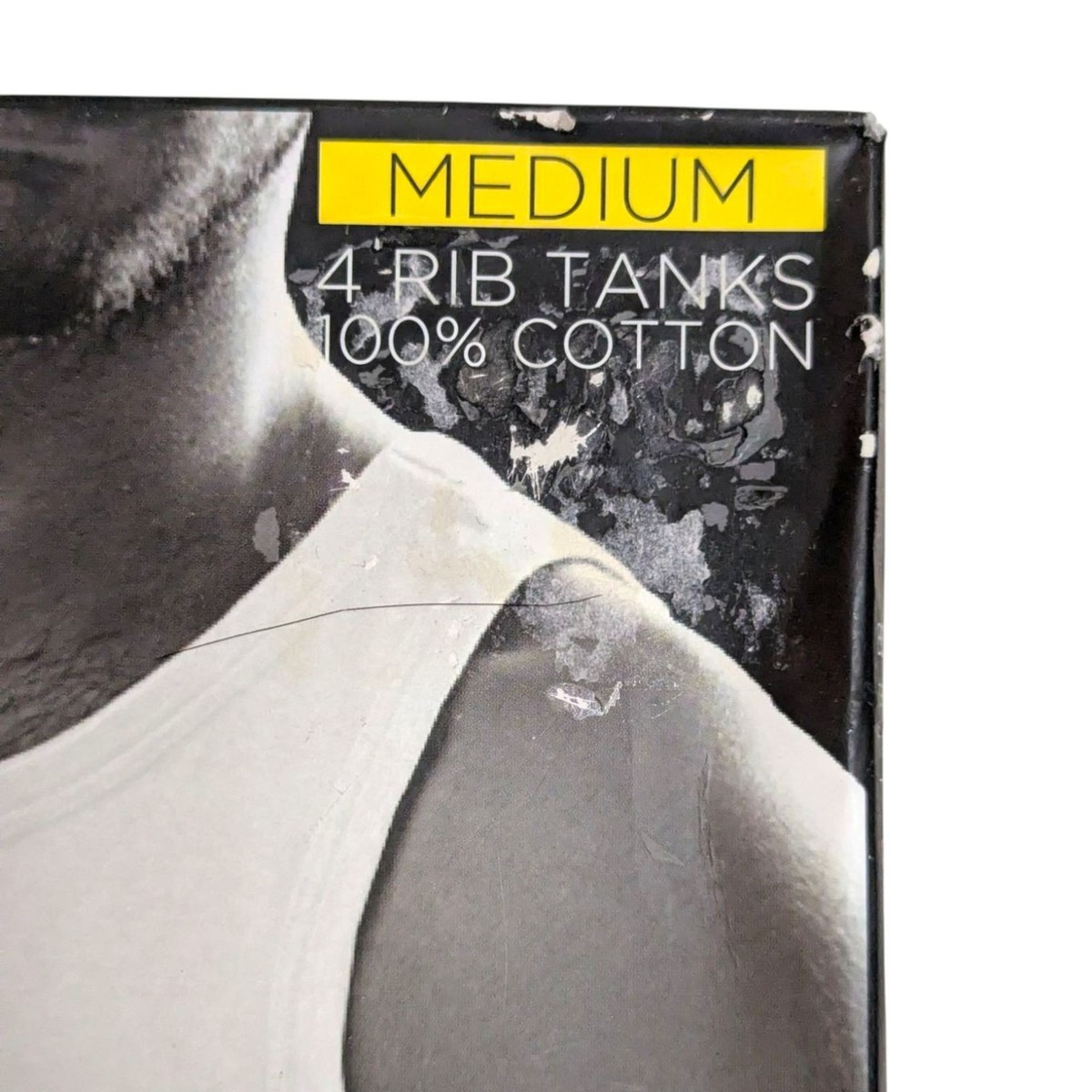 Brand new in package, but package shows some damage. Box is sealed and unopened. Comes with 4 rib tanks in white (X2), gray, and black. See photos for details.