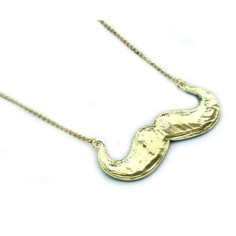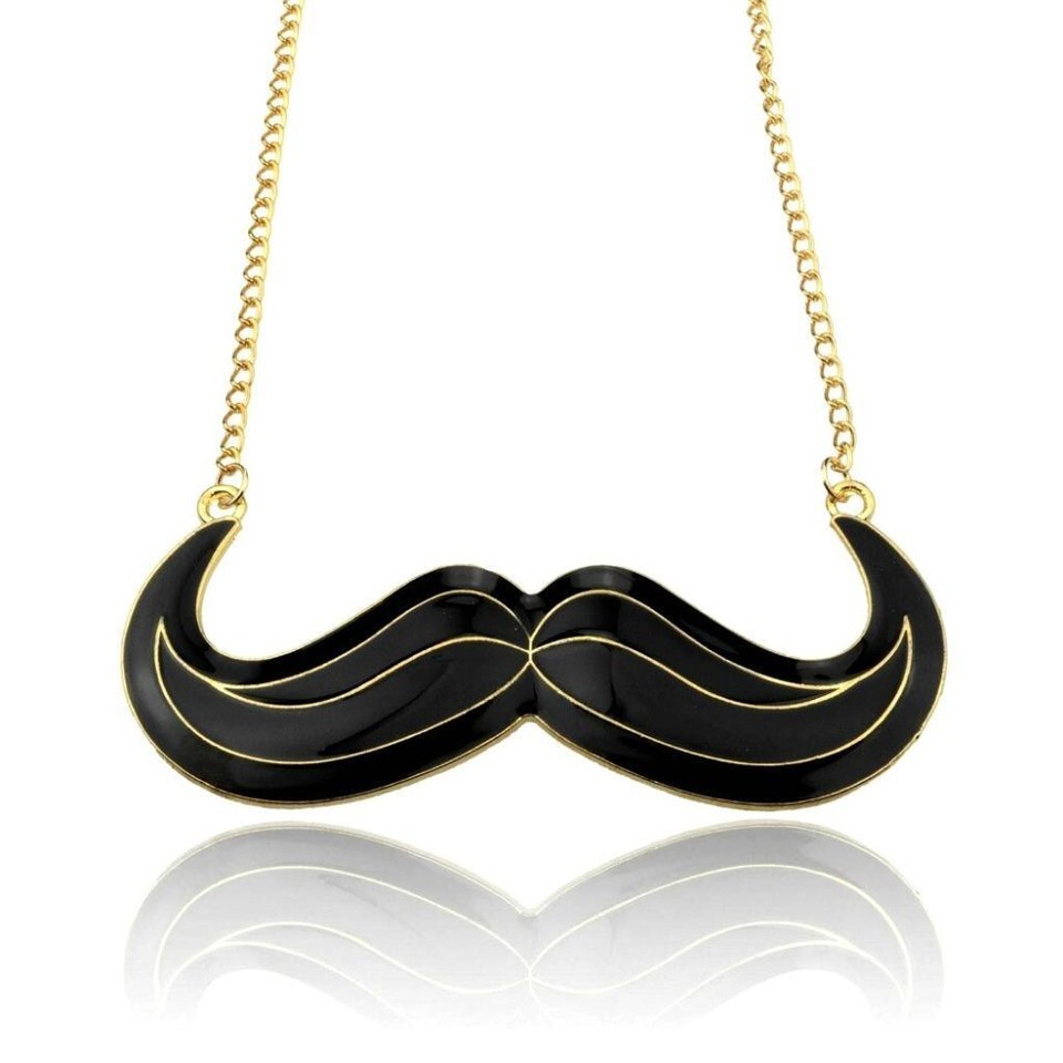 This super fun necklace features a black enamel mustache charm strung on a long gold tone chain (13.5" hang). This necklace does not have a clasp.