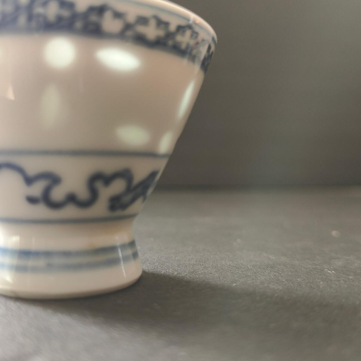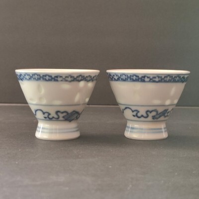 2 VTG Footed Rice Eye Pattern Ling Long Porcelain Tea/Sake/Egg Cups Blue White
