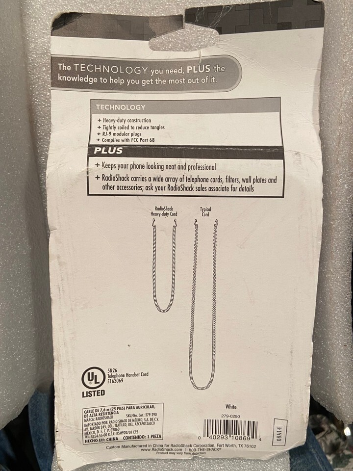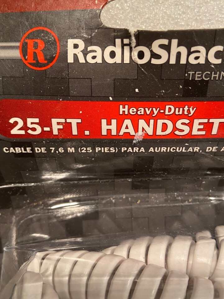 The handset cord is new in the package. It's old stock leftover from the Radio Shack store. It's a heavy duty white spiral handset cord for a landline home phone.