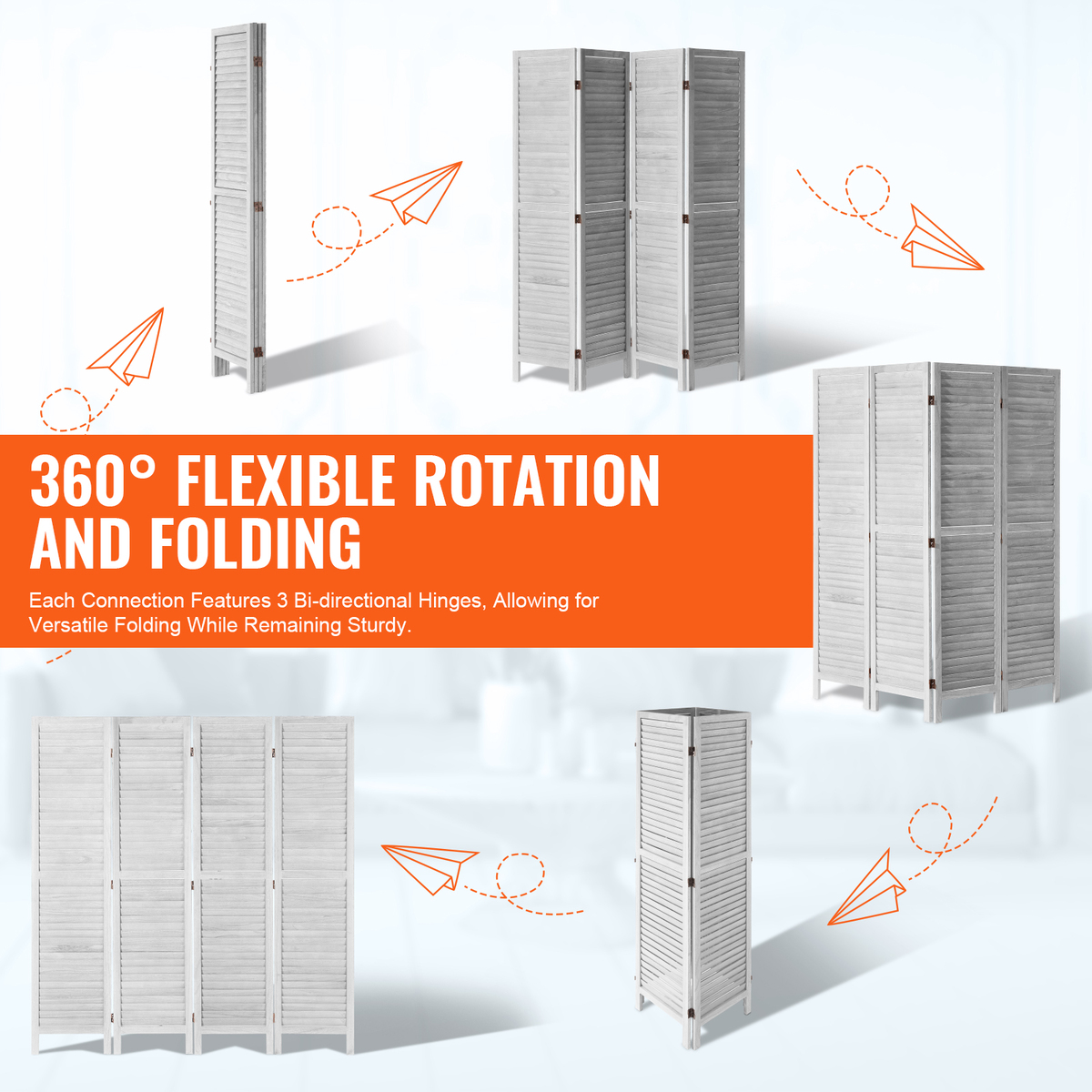 Flexible 360 Movement: Each room divider panel connects with three sturdy double-directional hinges, allowing you to rotate and fold at any angle. When not using it, fold it and tuck it away in a corner. For added stability, arrange it in a zigzag pattern to keep it from tipping over when fully extended.
