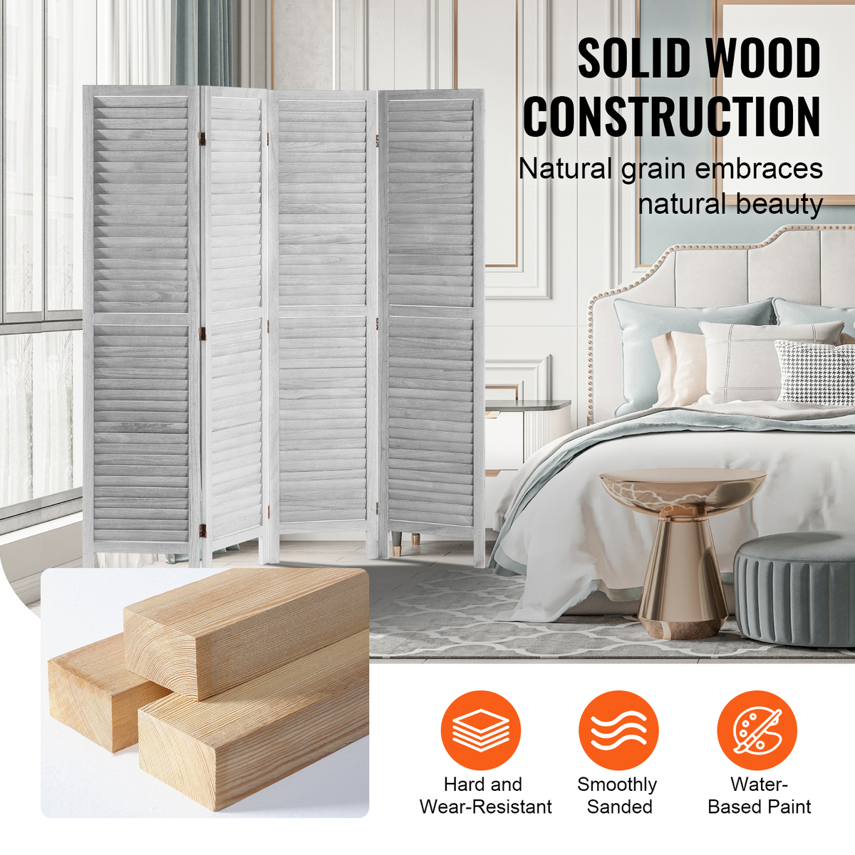 VEVOR Wood Room Divider, 4 Panel, 66.9 Inches Tall Wooden Partition (Light Grey)