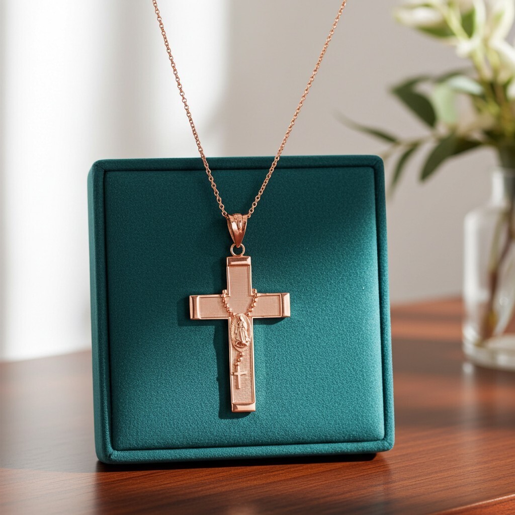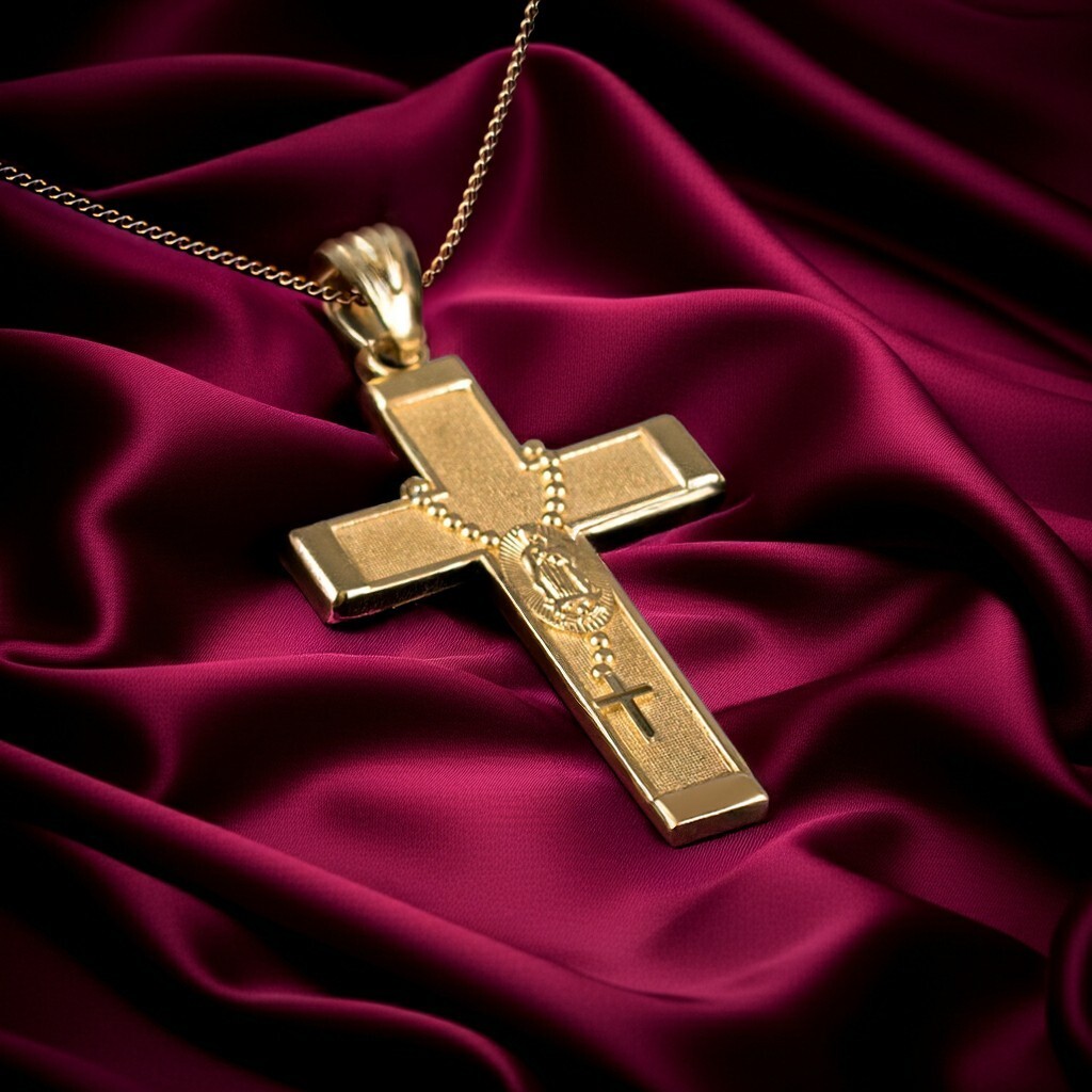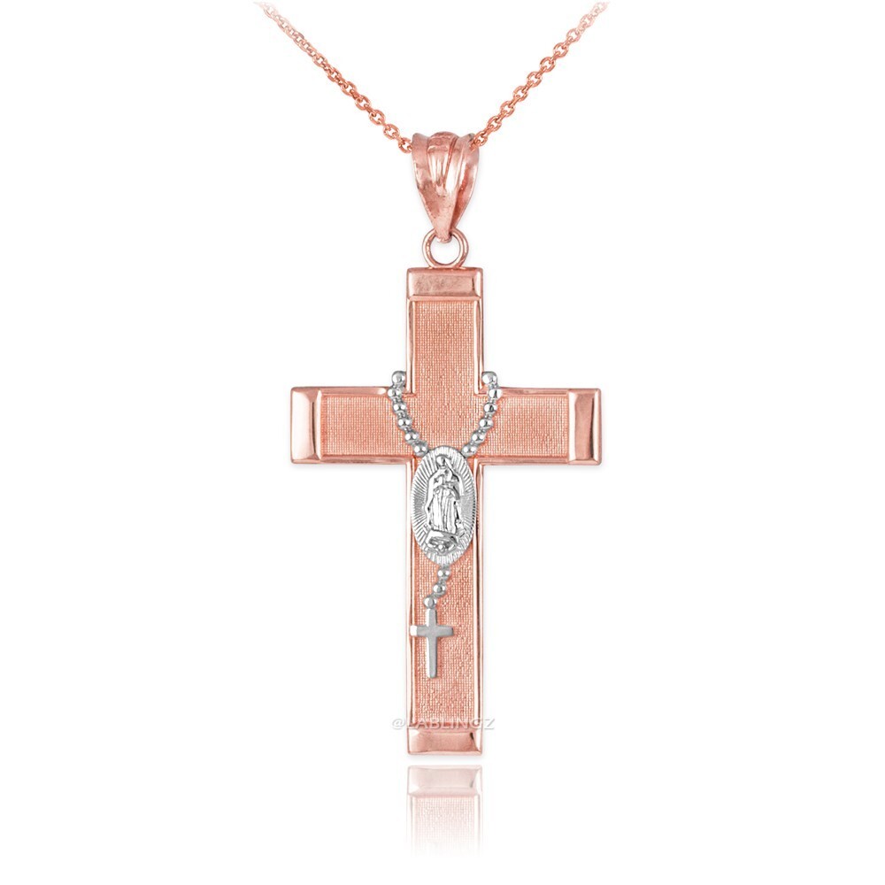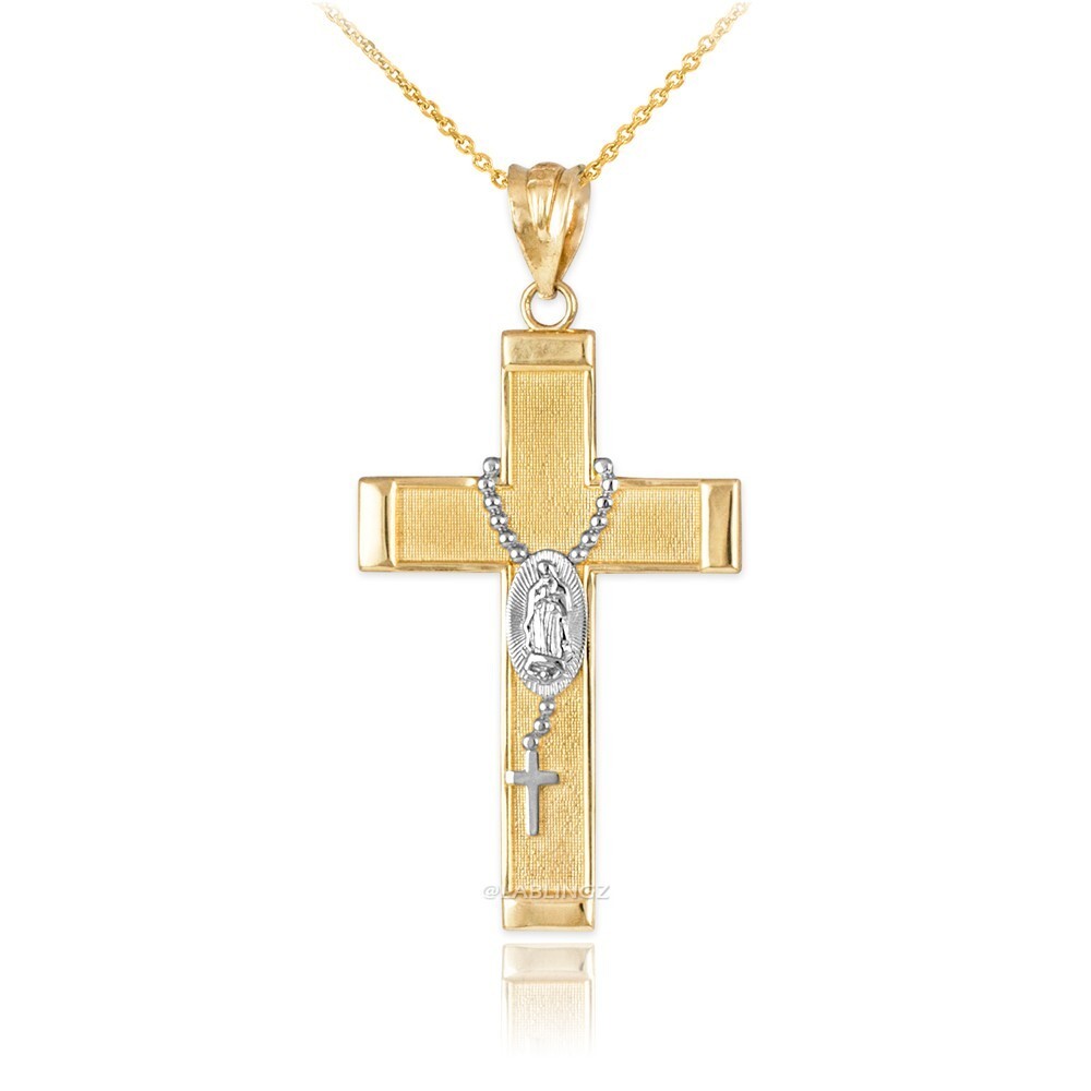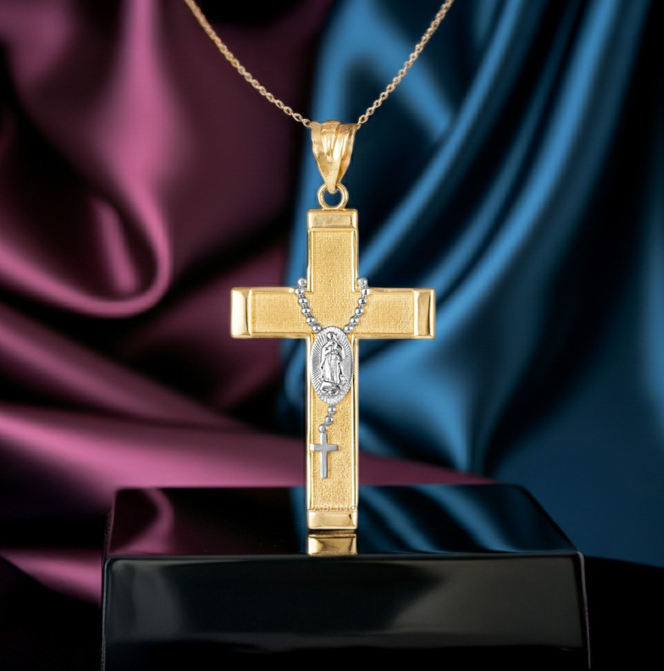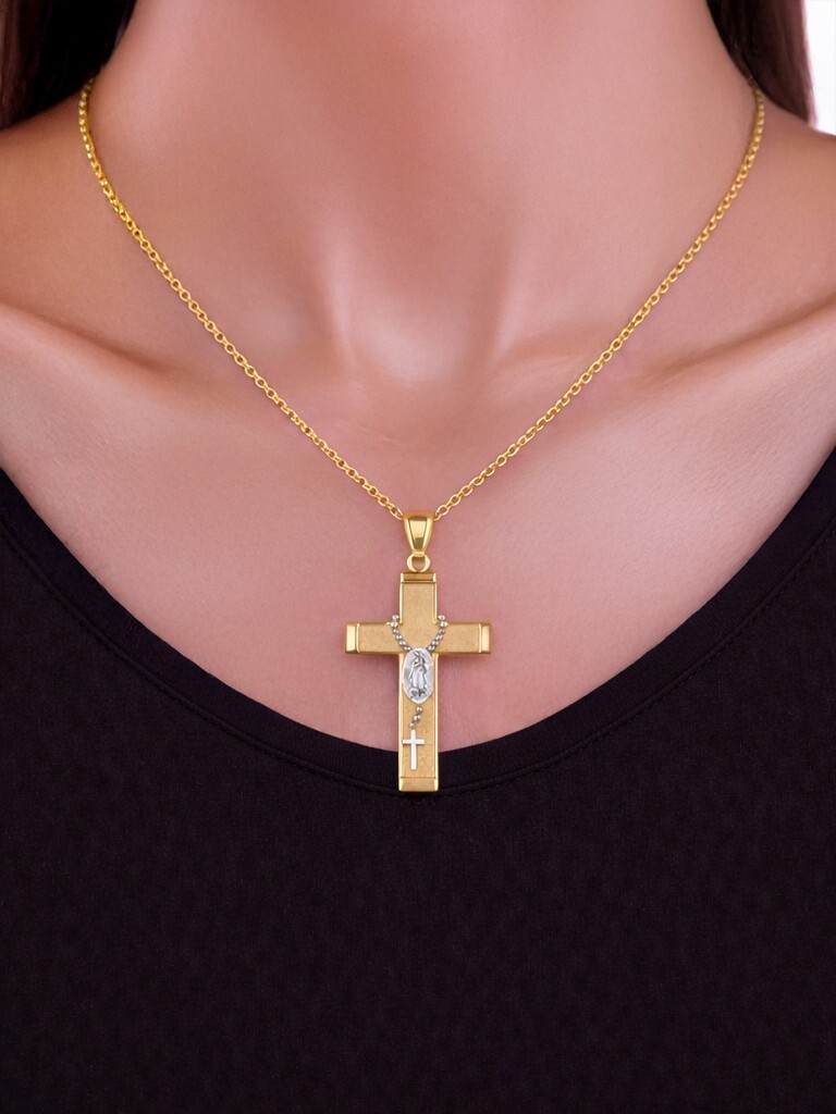 Gold Latin Cross Pendant Necklace with Our Lady of Guadalupe Rosary