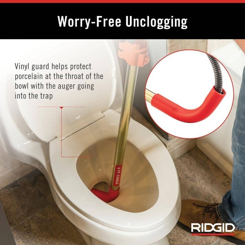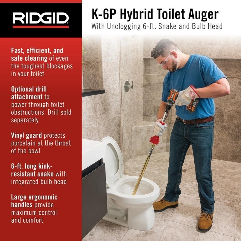 The RIDGID K-6P hybrid toilet snake auger (catalog number 56658) is the professional's choice and designed to provide safe and easy cleaning of toilet obstructions. This model features ergonomic dual grips and the handle is detachable to allow the option of adding a cordless drill (not included) to power through your toughest jobs. Quick lock adjustment extends the cable to 6 ft. to easily clear obstructions in and beyond the toilet. The vinyl guard protects the toilet bowl and the heavy-duty compression wrapped inner cable features a bulb-head auger for all-purpose cleaning. RIDGID - Built For Those Who Know.