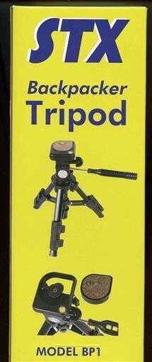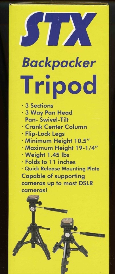 STX Backpacker Tripod . New in Box. Minimum height 10.5", Maximum Height 19 1/4", Capable of supprting cameras up to most DSLR Cameras