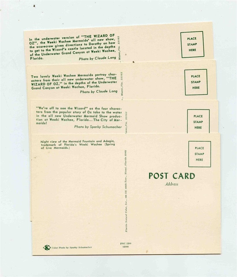 4 different Weeki Wachee Florida Mermaid Wizard of Oz Postcards. Circa 1960's