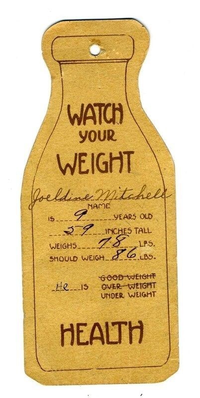 Play the Health Game 1920's Milk Bottle Shaped Paper Record of an underweight child. A program of the University of Texas Bureau of Extension, Division of Nutrition and Health Education. This was a worldwide program to aid in nutrition following World War One. In very good condition, measures about 2 1/8" x 5". Has the information on an underweight 9 year old boy named Joeldine Mitchell.