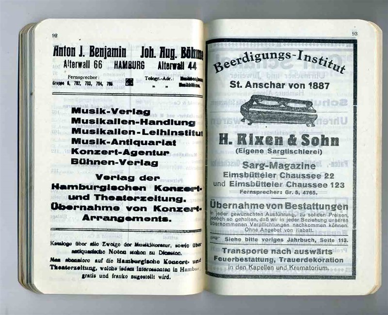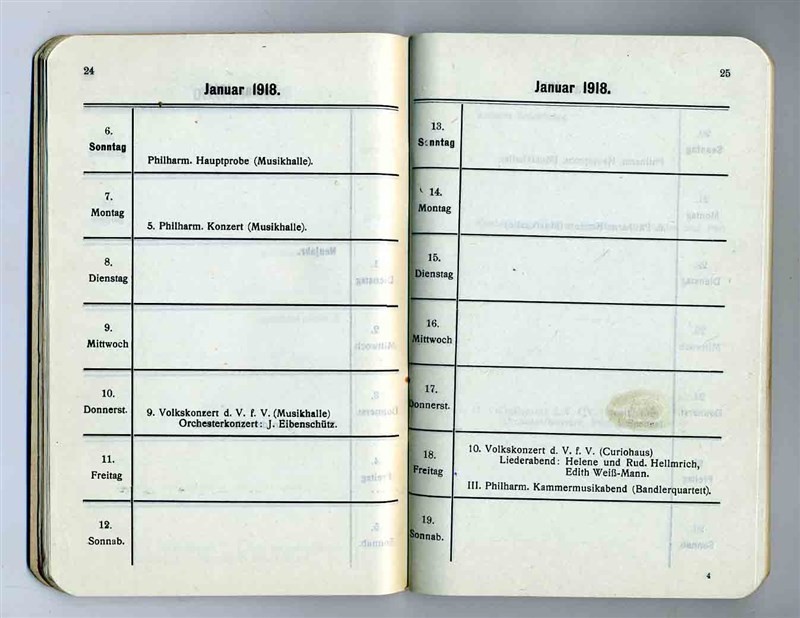 From the Hamburger Lehrer-Gesangverein. An unused Jahrbuch for 1917- 1918 from the Hamburger Teacher Singing Club. In very good condition with cover spine wear. The interior pages are unused and clean. The calendar pages go from October 1917 to September 1918. There are many blank pages of graph paper, many pages of music information, concert schedules, and lots of advertising pages. Measures about 4 1/8" x 6 1/4" when closed.