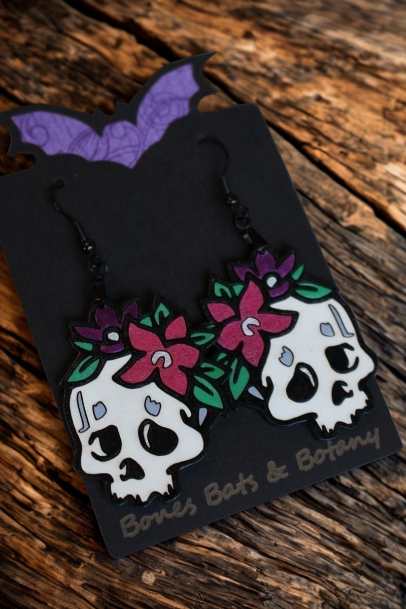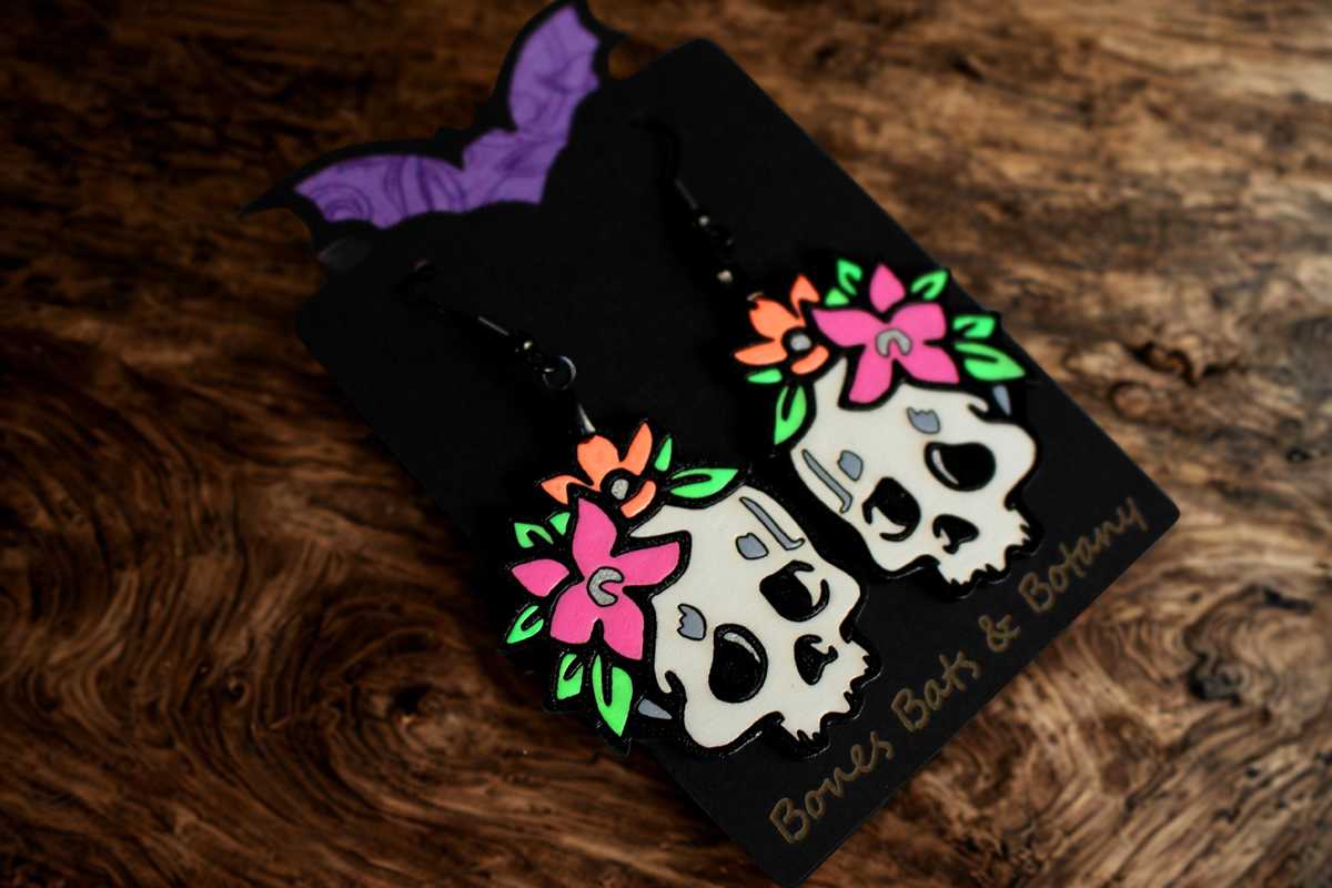 Day of the Dead Earrings, Cute Skull and Flowers Jewelry, Handmade Floral Gift