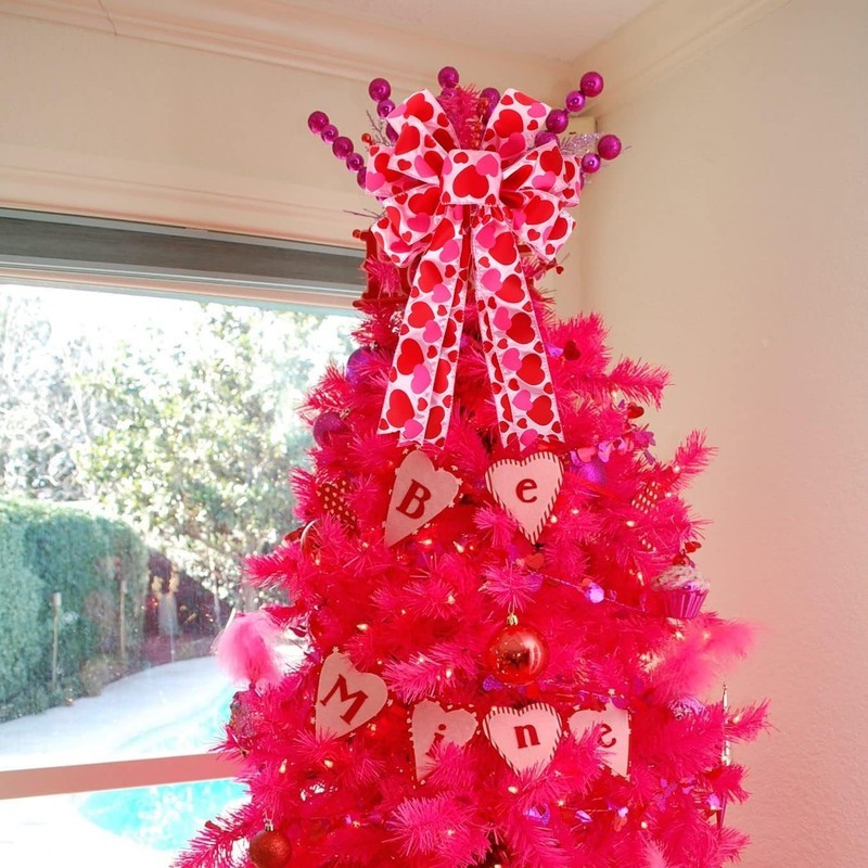 Valentine Tree Topper Bow with Heart Decorations, 11.4”X19.6” Large Red Pink