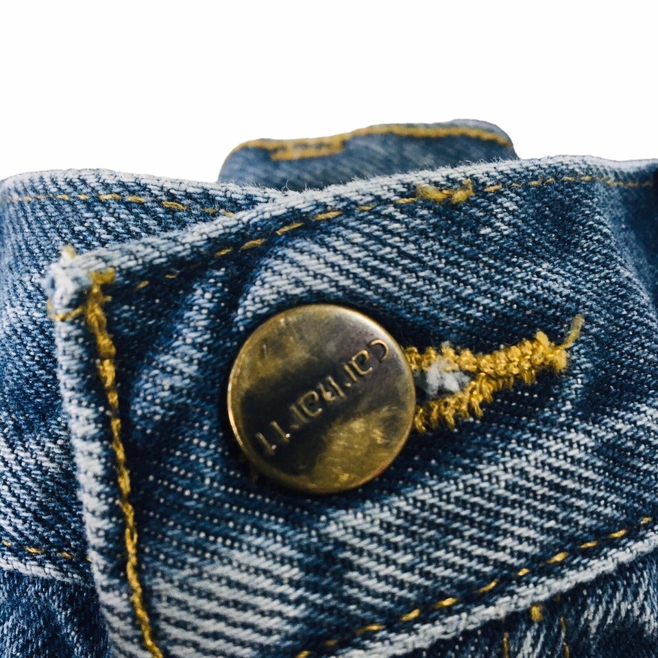 These Carhartt jeans in size 38- actually when measured they are a (37"x35") have a relaxed fit and straight leg style, perfect for casual wear. Made of 100% cotton denim with a medium wash, these pants feature a 5-pocket design and closure options of both button and zipper. The accents include the Carhartt logo and a rustic cowboy theme, making them a great addition to any wardrobe for the summer, fall, or spring seasons. These jeans are machine washable, making them easy to care for and suitable for everyday wear.