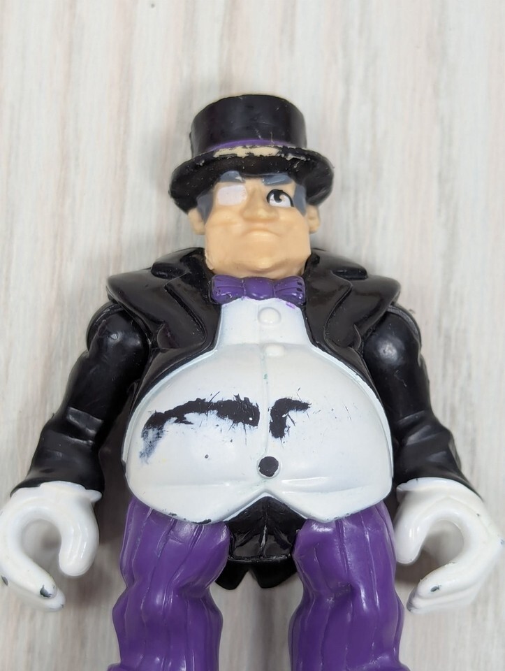 Used toys will show play wear to include scuffs, scratches, and or paint wear, with Penguin having quite a bit of paint loss on his stomach.