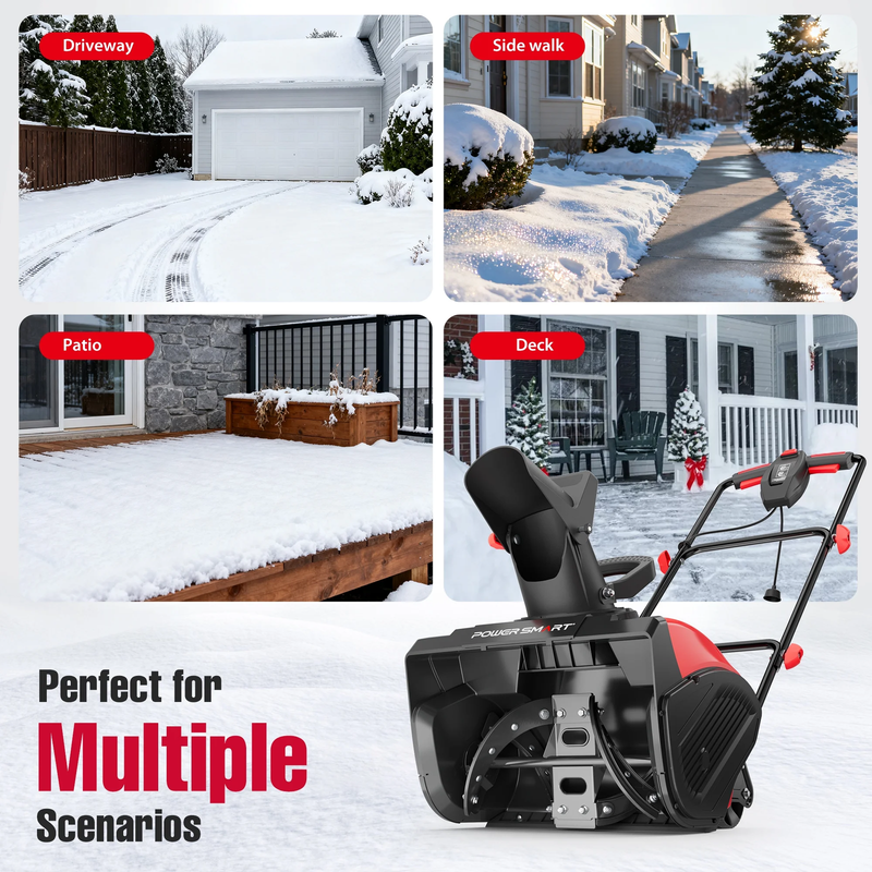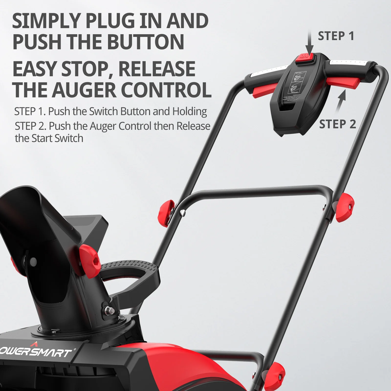 Clear snow easily with the Brand New PowerSmart snow blower. Its strong 120V 15 Amp motor gives you power and control. The 180-degree chute lets you direct snow just where you need it. With a rubber auger for better cleaning and longer run time, this snow blower is user-friendly. Enjoy a push-button start and lightweight design, perfect for sidewalks, steps, decks, and driveways. Embrace quick and easy snow clearing with this great tool!