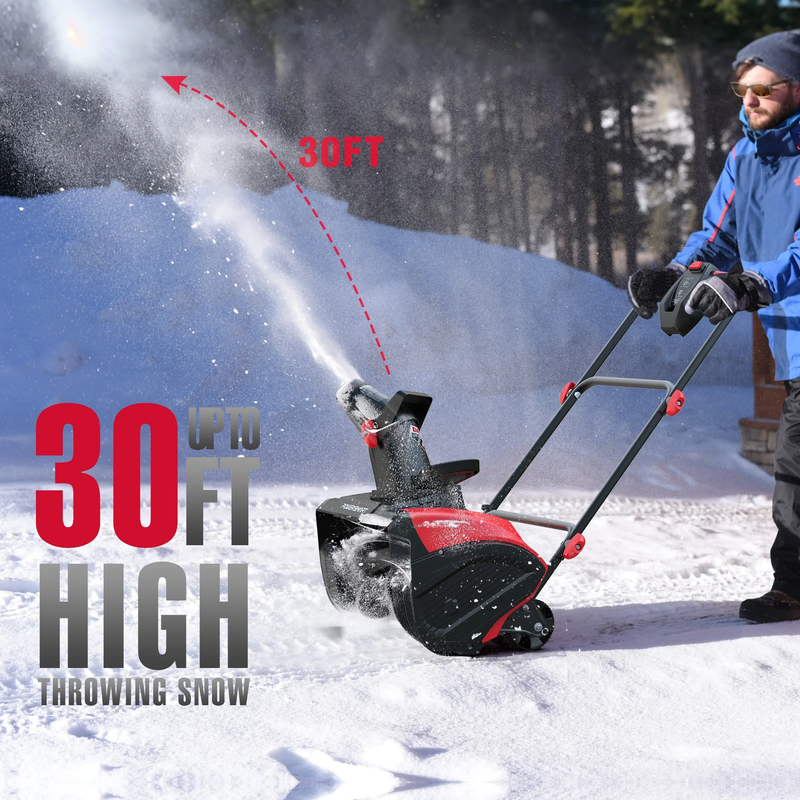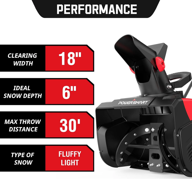 Excellent Clearing: Clears 18" wide, 6" deep, throws snow 30 feet?handles light snow with ease. Lightweight and Easy: At 31.2 lbs, it?s simple to move, great for sidewalks and tight spots. Powerful Motor: 15-amp motor clears snow fast, perfect for light to moderate snowfalls. Electric Power: Corded design means nonstop power, no refueling or charging needed. Easy Start: Just plug in, press the button, and clear snow?no waiting. Adjustable Chute: 180 chute control lets you aim snow exactly where you want. Durable Auger: Rubber auger for reliable snow clearing and long-lasting use.