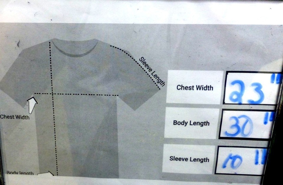 ? Chest Width = 23", Body Length = 30", Sleeve Length = 10"