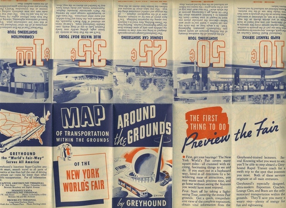 A Greyhound map of the transportation within the grounds and around the grounds of the 1939 New York World's Fair. In fine condition. Opens to about 12" X 9" and folds to pocket size. Has the cost of each type on World's Fair transportation.