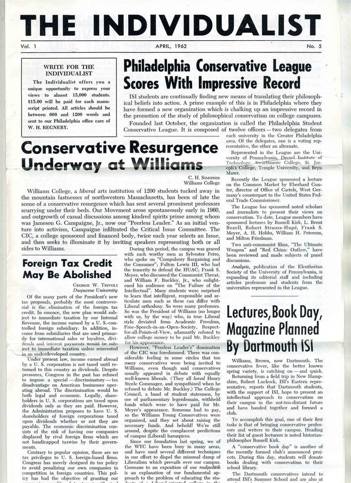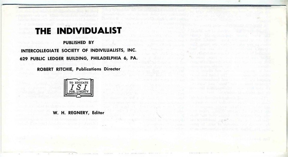 The fifth issue of the newsletter published by the Intercollegiate Society of Individualists in Philadelphia, 1962. This 6 page issue has articles on: The Philadelphia Conservative League,ipso Facto or Ipso Fixit: Quo Vdis Liberalis, Baer Facts and more. In very fine condition .