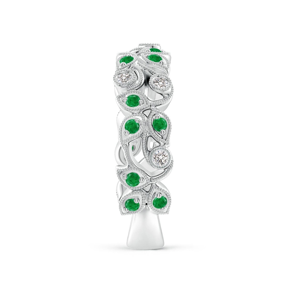 This wedding band showcases a nature inspired design and is adorned with pave-set emeralds and bezel-set diamonds. Milgrain detailing on the edges lends a touch of intricacy to this vine wedding ring, masterfully crafted in 14k Gold.
