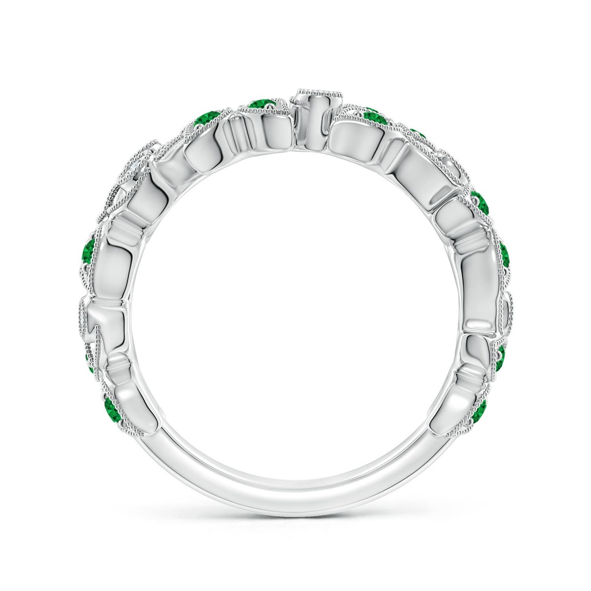 This wedding band showcases a nature inspired design and is adorned with pave-set emeralds and bezel-set diamonds. Milgrain detailing on the edges lends a touch of intricacy to this vine wedding ring, masterfully crafted in 14k Gold.