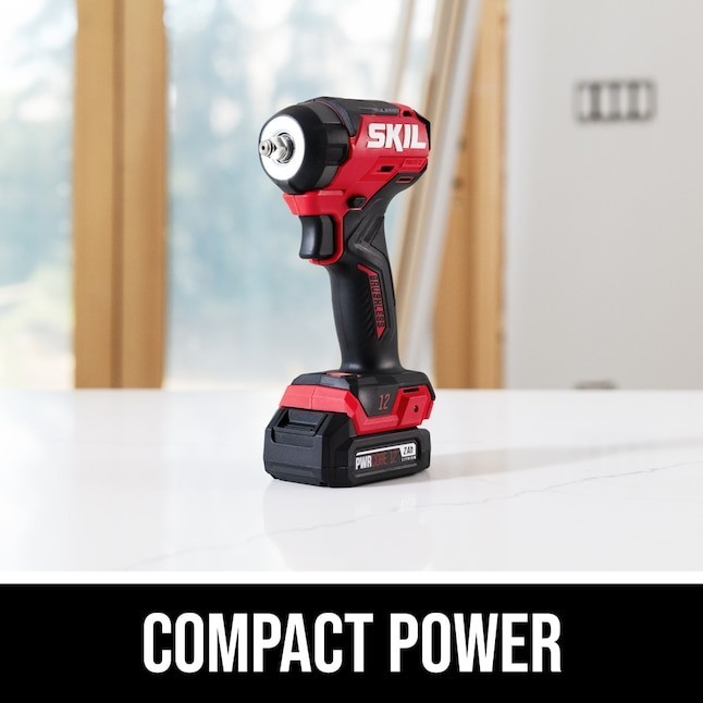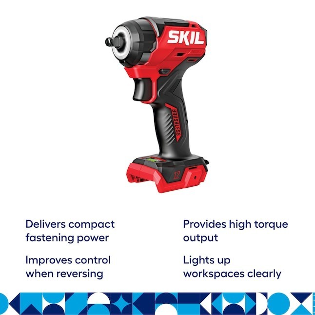 The SKIL PWR CORE 12? Brushless 12V 3/8-inch Impact Wrench gives you big power in a compact, lightweight package with up to 125 foot-pounds of fastening torque, 200 foot-pounds of nut-busting torque, and up to 3400 IPM for driving tough nuts and bolts. At 1 inch shorter than its previous generation, it?s an ideal cordless impact wrench for working overhead in hard-to-reach spaces. The power tool features a 3/8-inch square anvil with a friction ring for easy socket changes, and its digital brushless motor combined with three-speed selection provides high-performance power and precise control. Its Halo Light? provides 5X more light than common LEDs while reducing shadows?and lights up your workspace for up to 10 minutes.