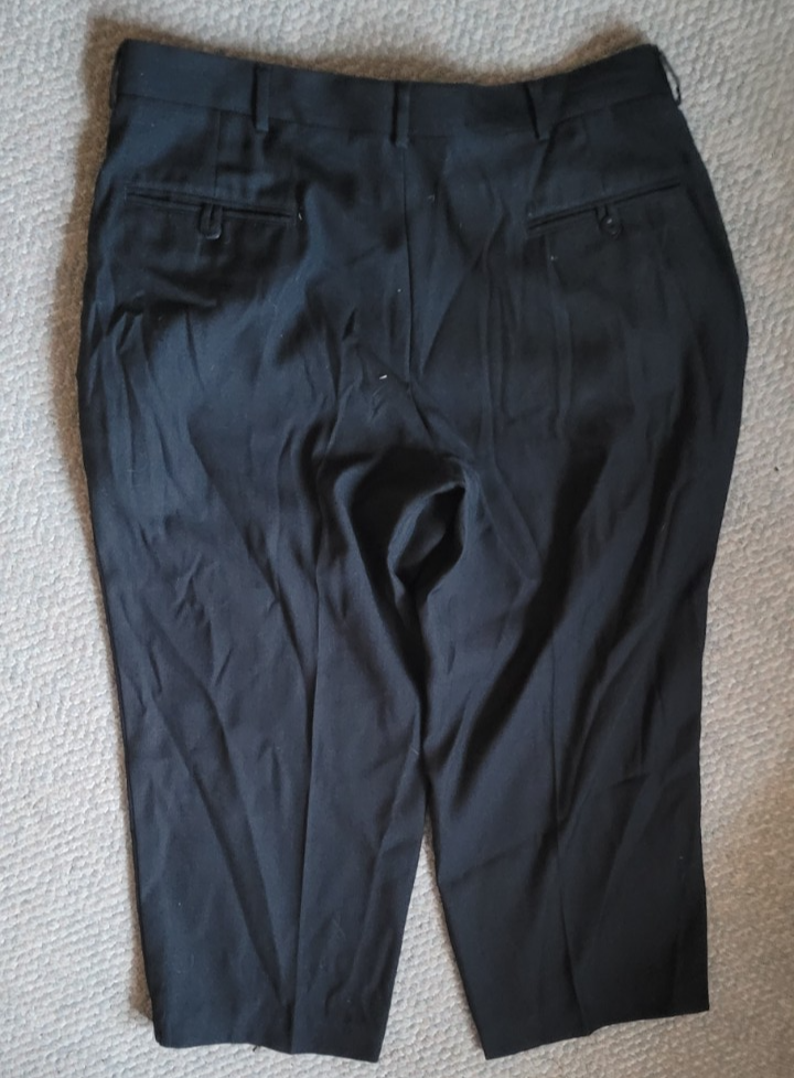 These dress pants are in good used condition. There are no holes or stains that I found. The zipper works well. The button is intact. The size is 36x29. Measurements are approximately: Length: 32 inches. Inseam: 22 inches. Waist: 18 inches. Rise: 12 inches.