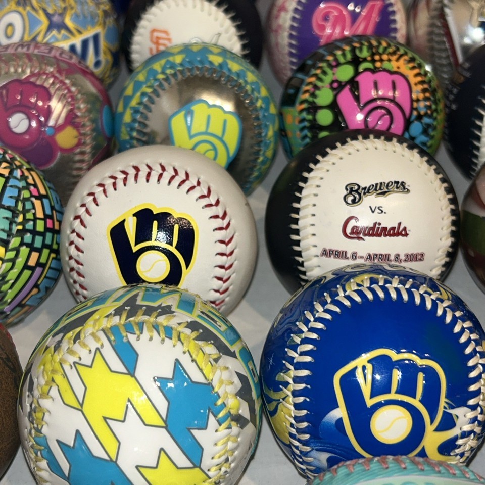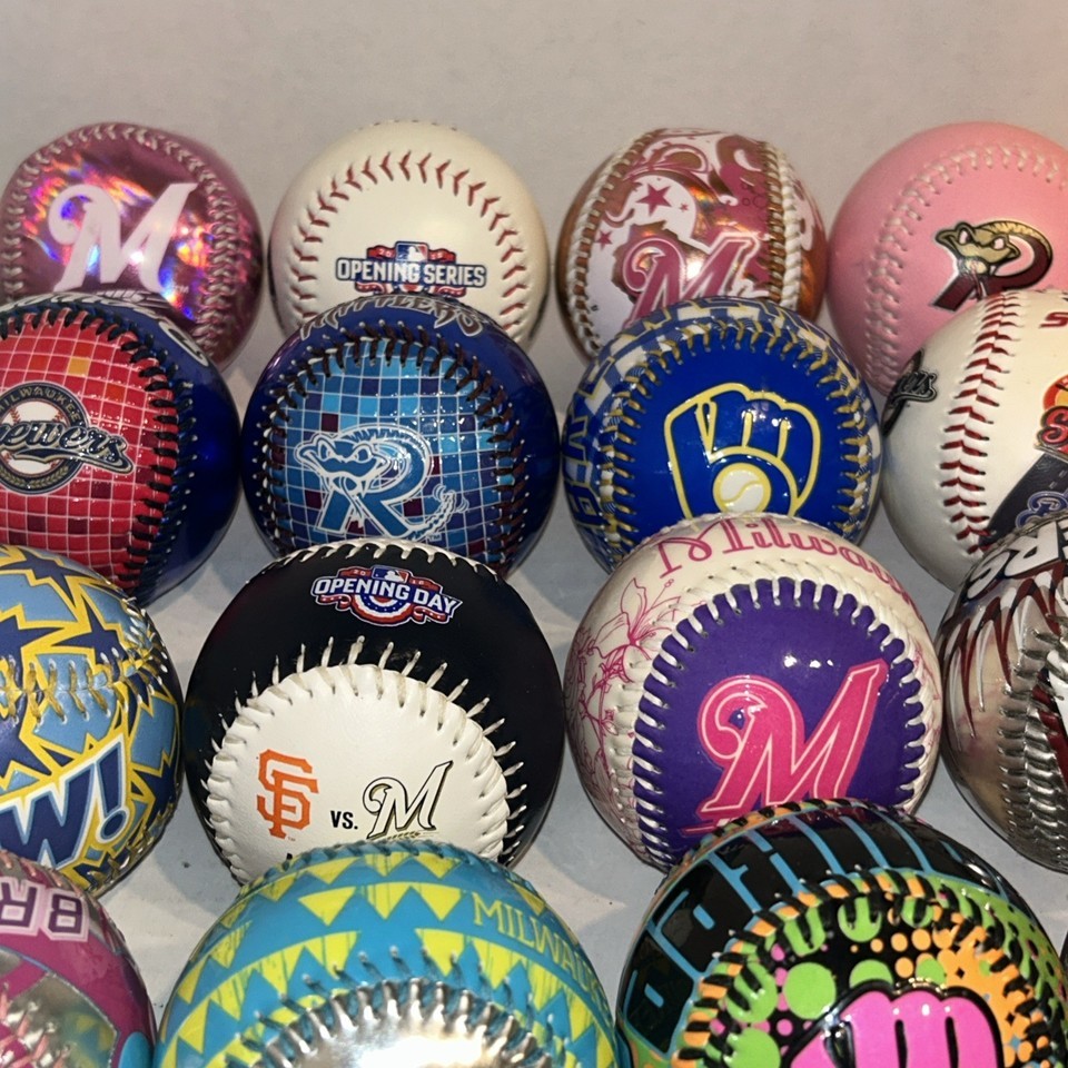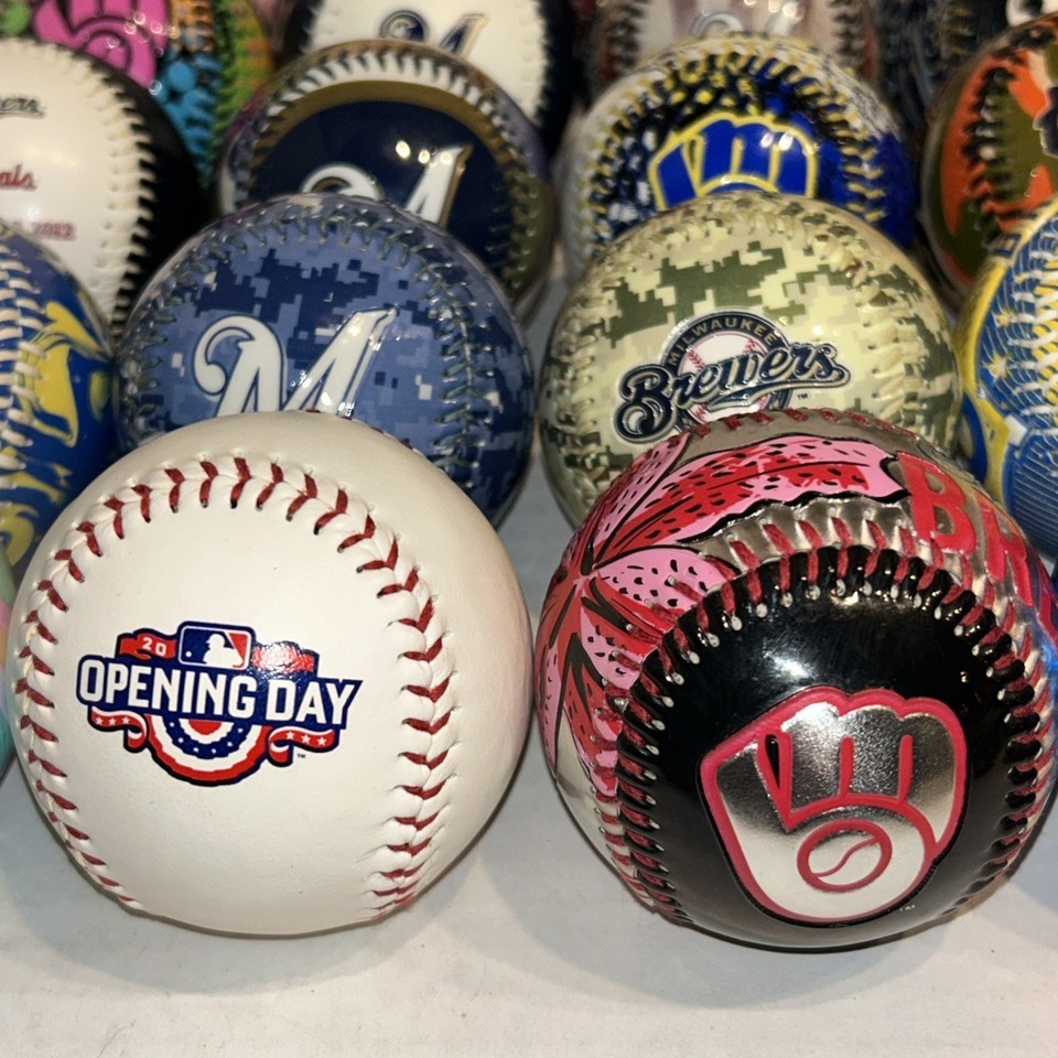 Has some opening day and opening series balls in the lot each one featuring the Brewers.