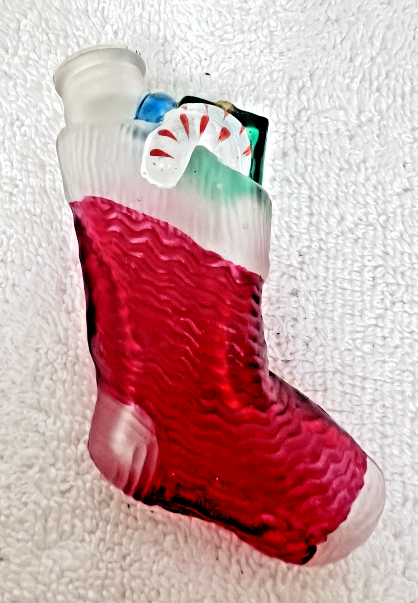 Old World Ornament Red Christmas Stocking Glass Light Cover Hand Painted Original Sticker 3". One unused sticker across the opening, and one used with sticker still present but inside the cover red Christmas stocking measures approx. 3" top to heel of sock and 2" heel to toe. Paint coloring in very good condition with minimal to no wear. See pictures.