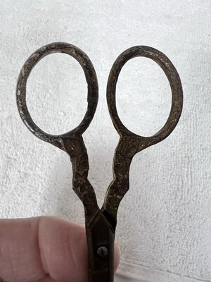 Vintage Antique Embroidery Scissors Worn Gold Gilt Decorated Floral Flowers Leaves Handles 3 5/8". Good condition used scissors, worn gilt on handles, signs of age wear, still work. See pictures. Selling as shown/found.