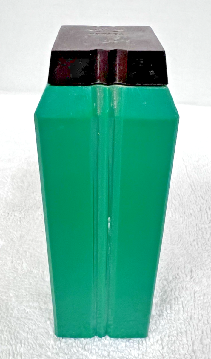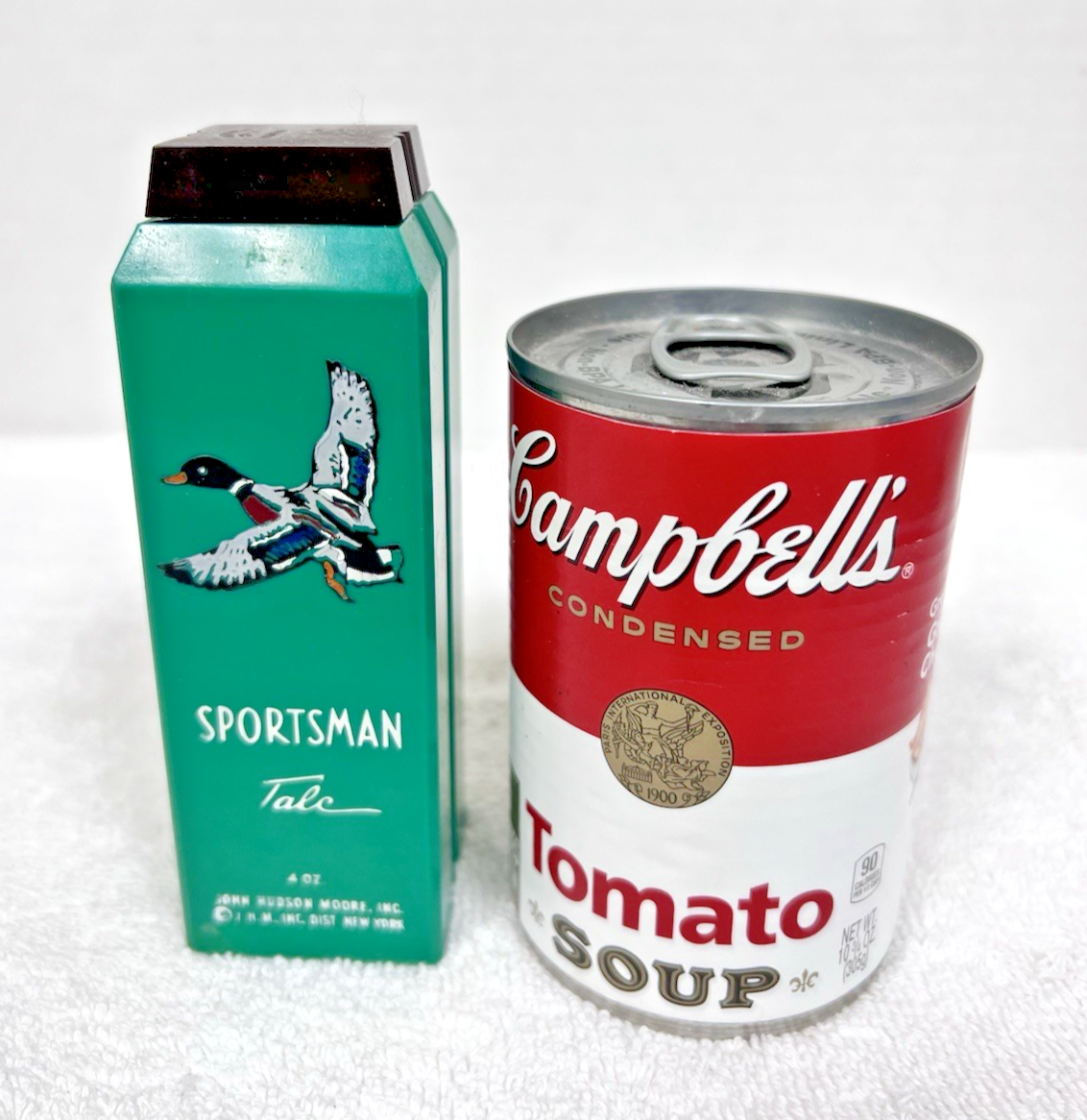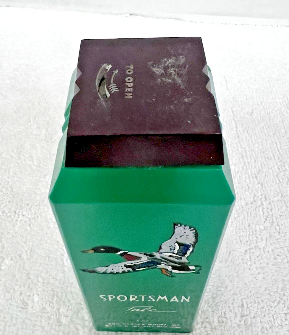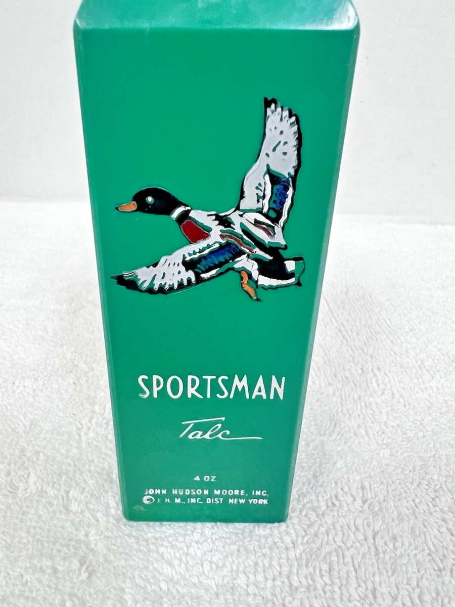 Vintage Sportsman Flying Duck After Shave Talc Old Green Plastic Bottle produced John Hudson Moore Inc New York measures approx. 5 1/4" tall and has talc inside. Swivel open top in very good shape as is duck and lettering on the green background. No cracks or breaks in the vintage plastic talc bottle jar. See pictures.