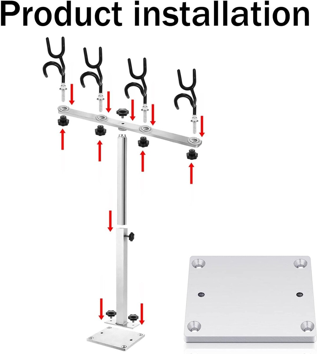 Inside the Packaging: the packaging is equipped with 1 fishing rod bracket, 1 support sole plates(pole holders are not included); The support base plate can be easily replaced and carried, please note: one of the two base plates is already assembled with the product, and the other is placed in the packaging