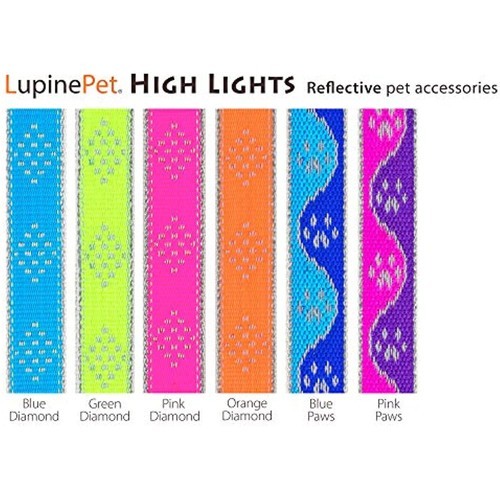 Lupine High Lights are made from nylon with reflective threads woven into the front, back and edges for maximum visibility. The reflective threads bounce light back to an observer so that these products may be seen in low-light or dark conditions when light shines on them. Made with strong bar-tack stitching, welded steel hardware, and ends which are turned under and stitched to protect fur and skin. Matching collars and harnesses are available.