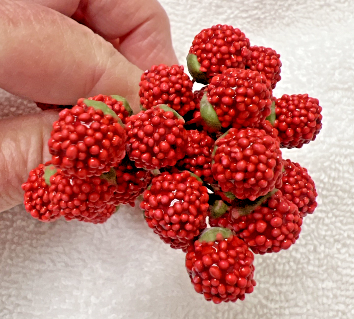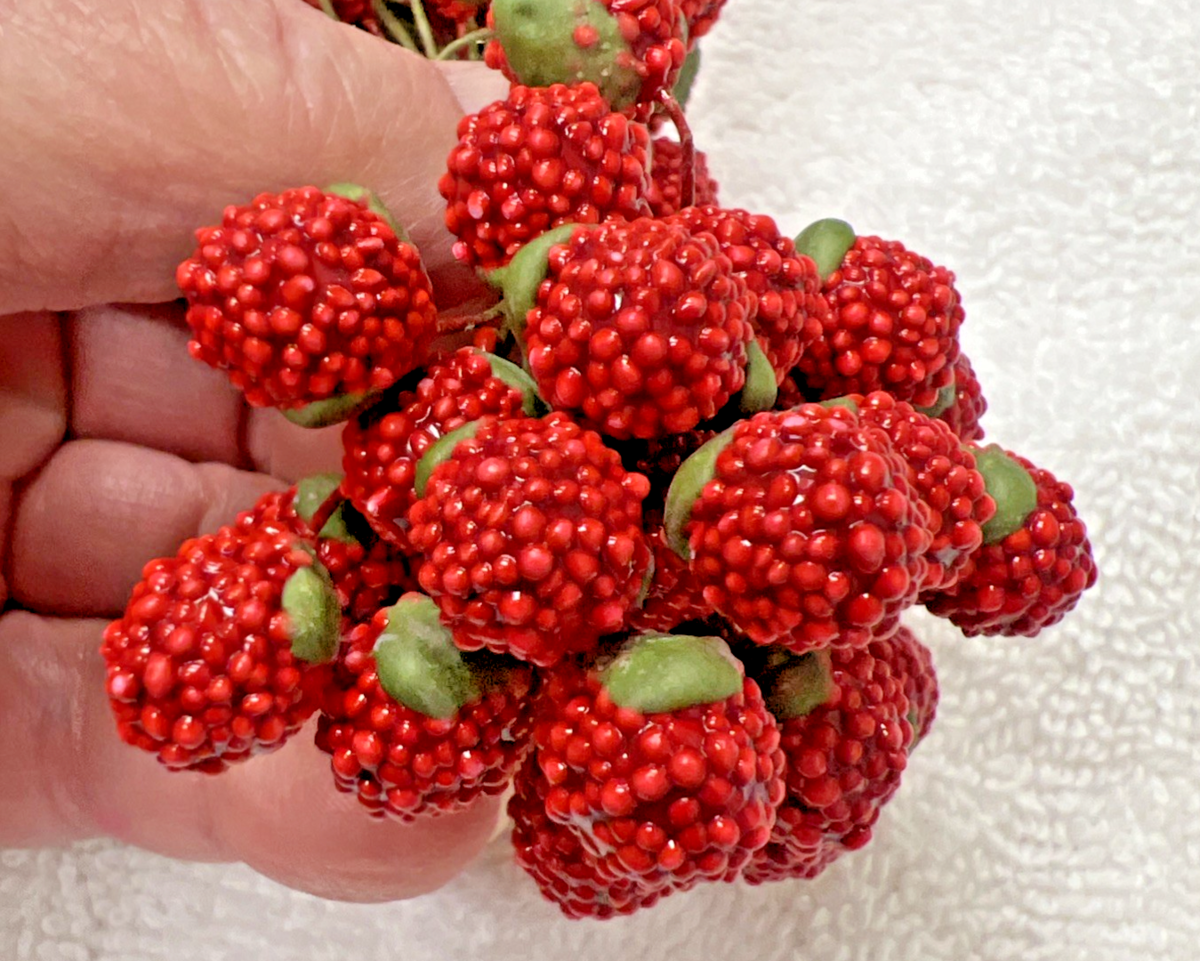 Vintage French Millinery Beaded Glass Wire Red Raspberry Bouquet Bunch. Bouquet of red raspberries measures approx. 4" long with raspberries on both ends and green covered wire. Very good condition bunch bouquet of red berry beads flower bouquets, one tiny missing spot of color is all I find. See pictures.