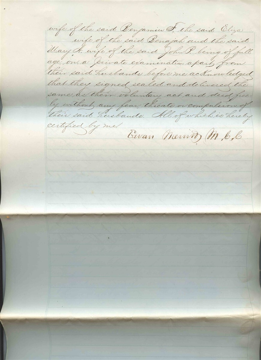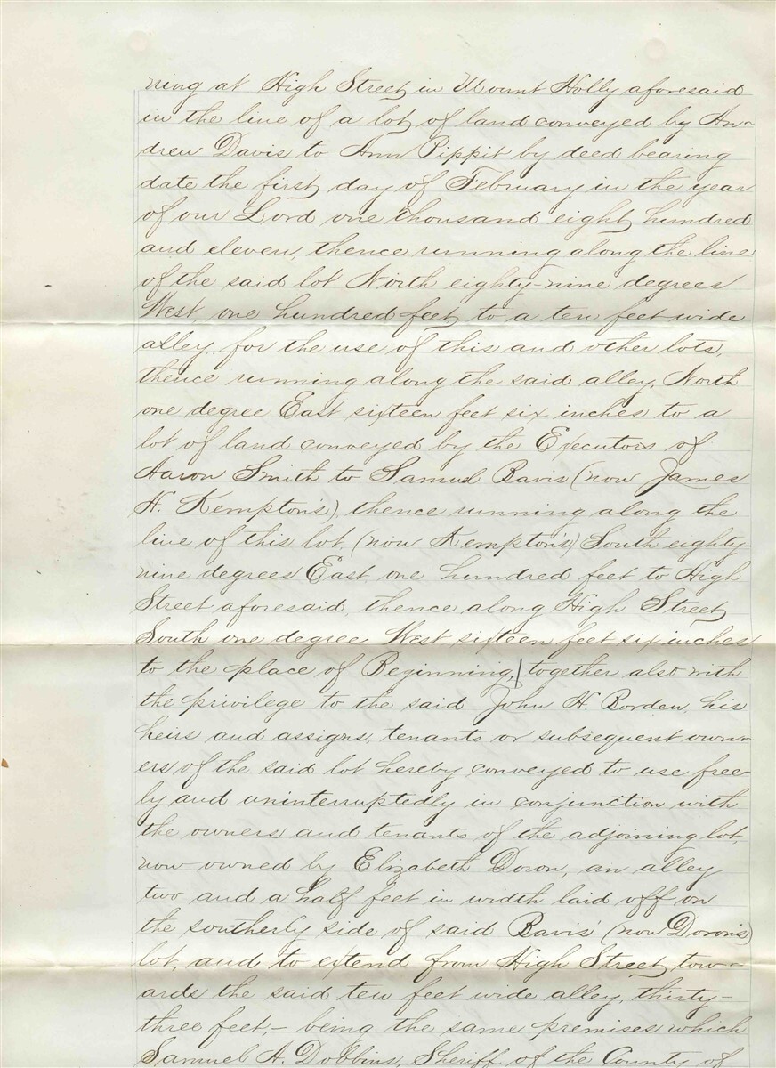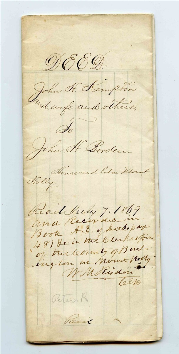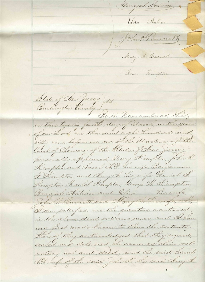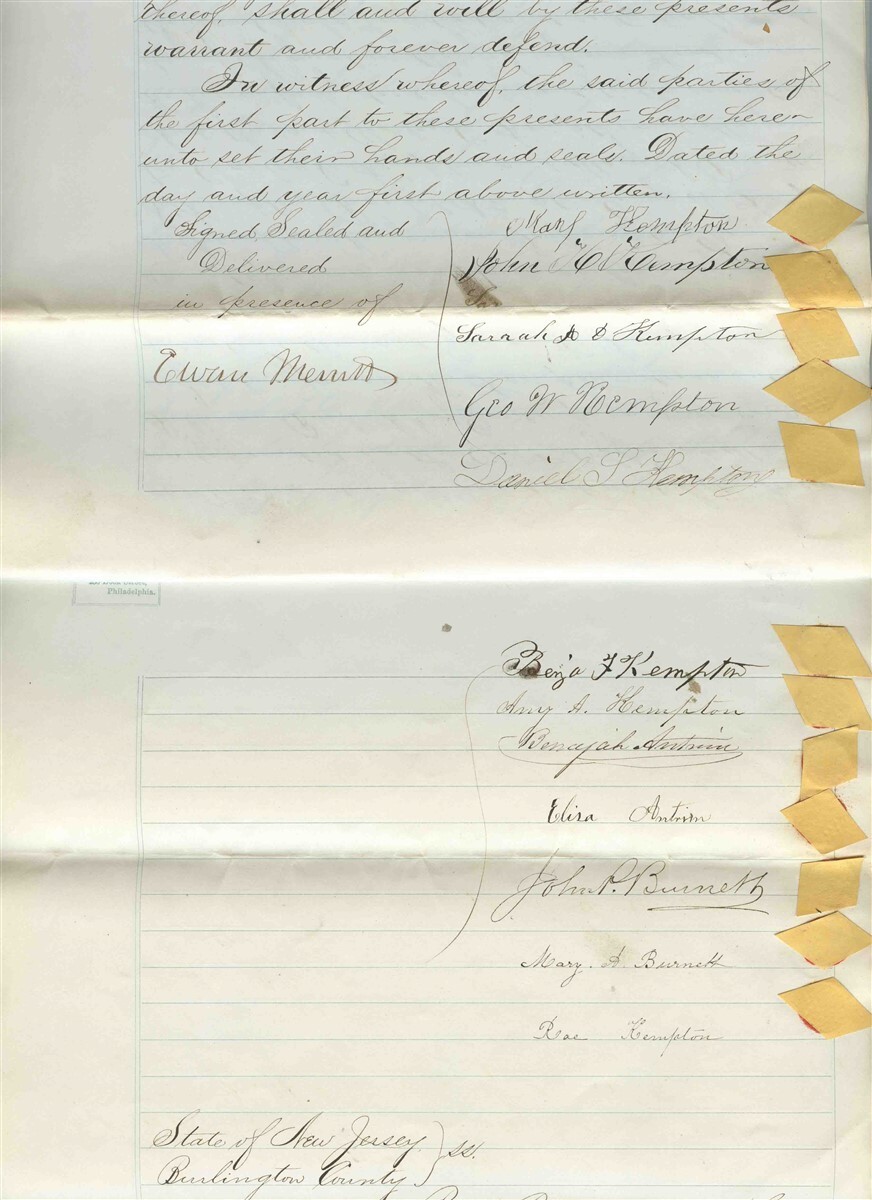 4 large hand written page Deed bound together. Hand Written Property Indenture with Conveyance Inter Revenue Stamps and Seals, Dated 1869 for a property in the County of Burlington in the State of New Jersey. Pages measures about 8 3/4" x 14" . Signed by the County Clerk. Seller was John Kempton to Buyer John Borden . Both were from prominent area families
