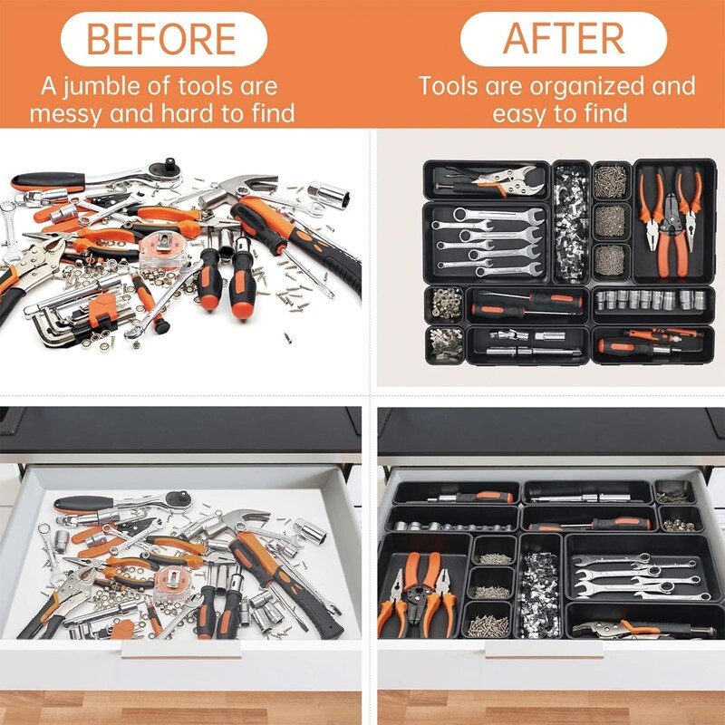Stylish and Identifiable Black Organizers: Black trays help quickly identify tools like pliers, wrenches, and screws, making them ideal for busy work environments.